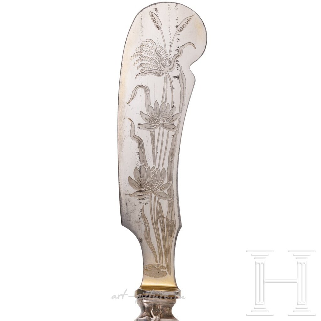 Четыре столовых прибора в стиле модерн в футляре, Россия, датированы 1903 годом. Серебро с минимальными остатками позолоты. Лезвия и зубцы вилок не серебряные. Состоит из двух вилок с двумя зубцами и двух ножей. Ручки с рельефным цветочным орнаментом и выгравированной монограммой "ECW" кириллицей и датой "29 7 903". На лезвиях ножей выгравированы водяные лилии. На них нанесен штамп районного пробирного управления с пометкой "Тонкость".