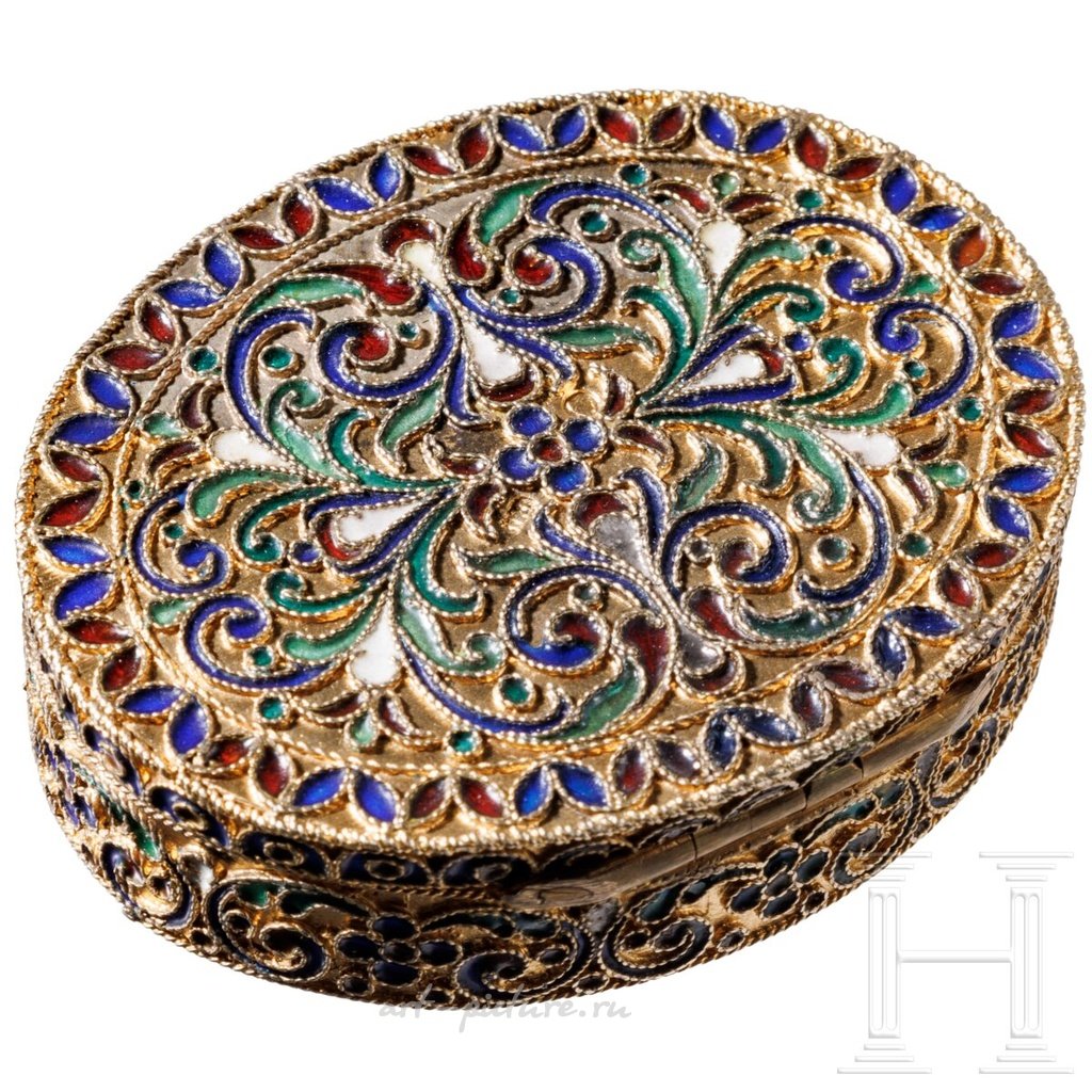 Эмалевая пилюльница, Санкт-Петербург, Григорий Панкратов, 1908 год. Серебро, позолота. Овальная форма, окруженная красочной эмалью в виде листвы, украшенная серебряной проволокой. Край раздвижной крышки украшен стилизованной листовой бордюром. Помечена на крышке и дне маркой районной инспекции и мастера "ГП" на кириллице, а также поздней латвийской маркой импорта. Размеры 1,6 x 5,8.