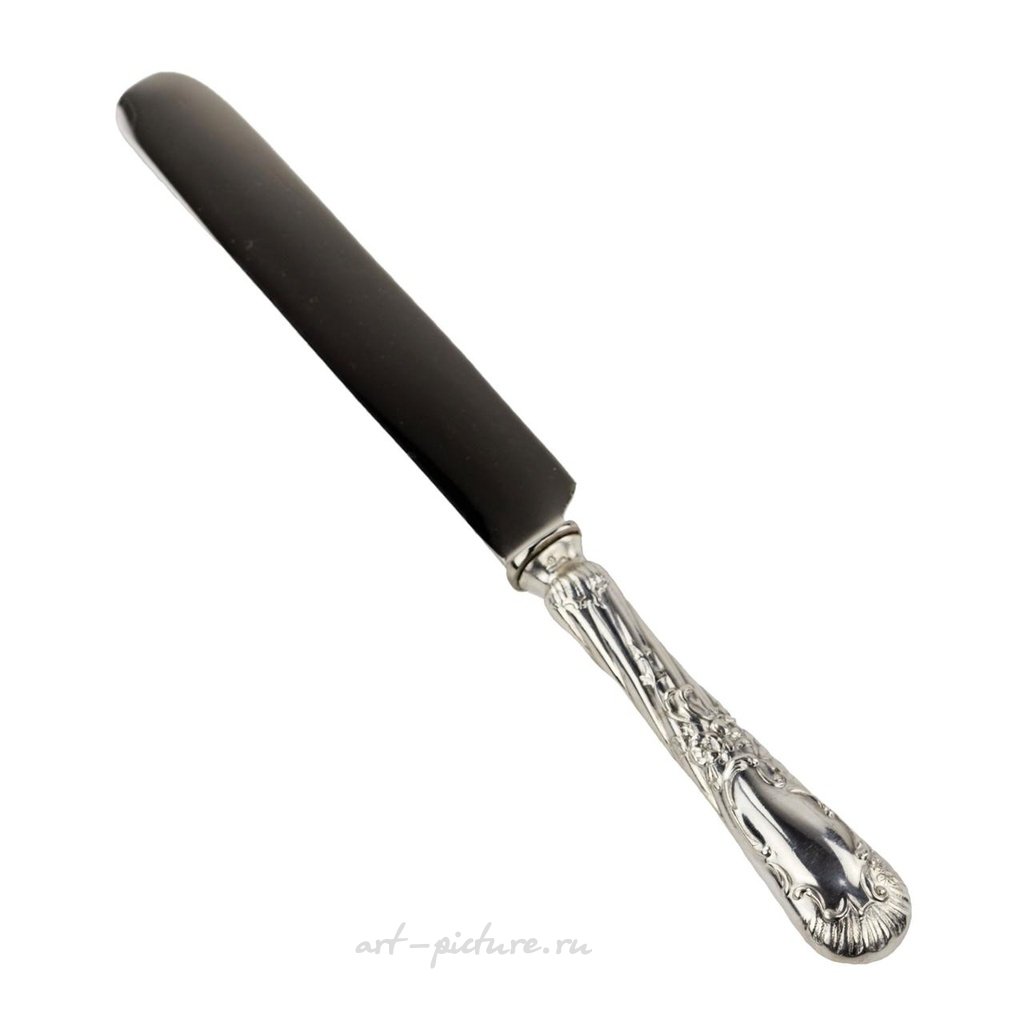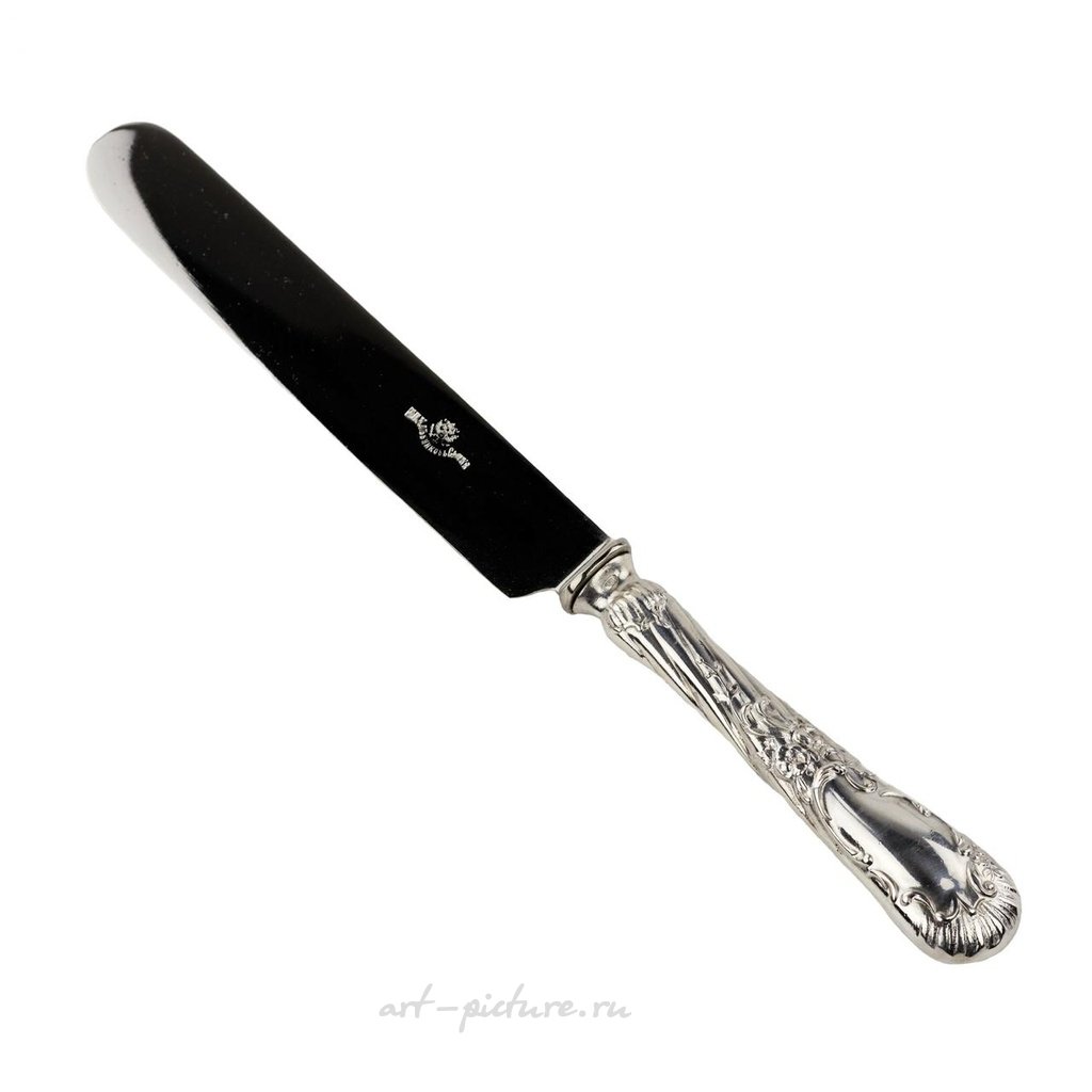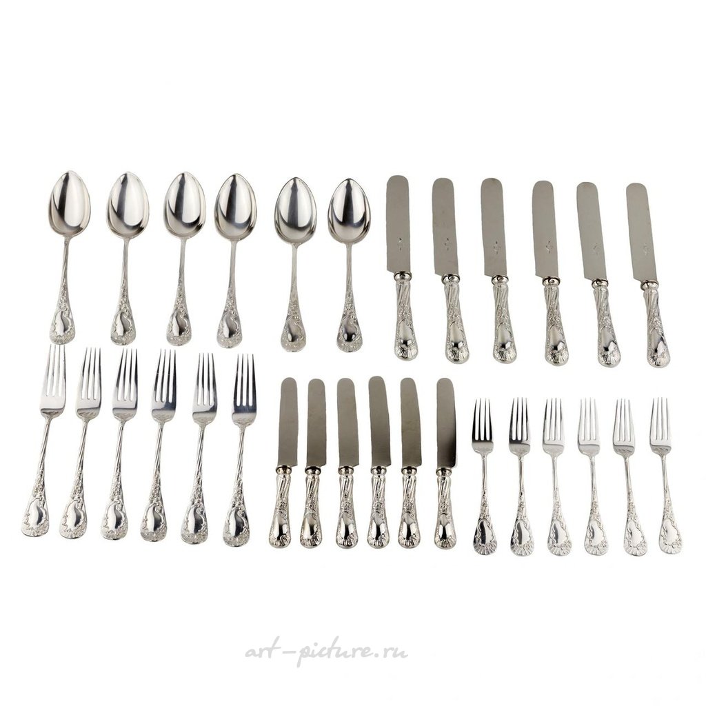 Хлебников. Набор столового серебра (30 предметов) на 6 человек. Серебро 84 пробы. Общий вес: 2423 г. Российская империя. 1908-1927 гг. Набор состоит из: 6 столовых ножей, длина 25,8 см, общий вес 600 г; 6 столовых вилок, длина 21,5 см, общий вес 420 г; 6 столовых ложек, длина 21,8 см, общий вес 450 г; 6 чайных ложек, длина 14,5 см, общий вес 300 г; 6 десертных ложек, длина 17,5 см, общий вес 300 г; и 6 десертных вилок, длина 18,5 см, общий вес 350 г. Набор выполнен в стиле российской империи и отличается высоким качеством и изысканным дизайном. Это ценная коллекционная позиция, которая будет прекрасным дополнением к любому сервизу.