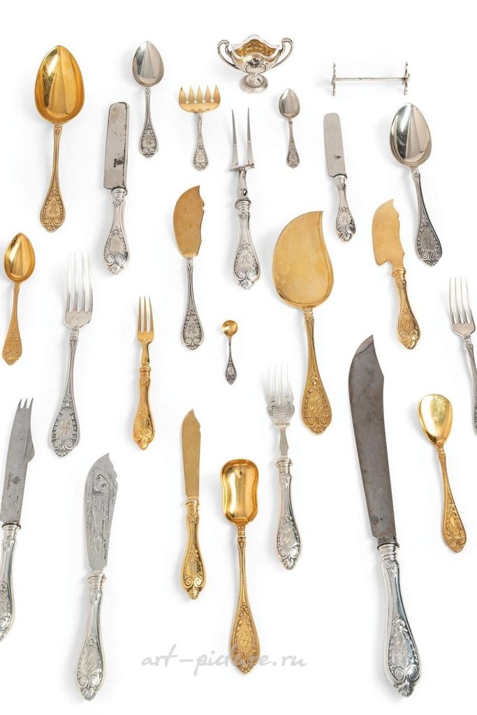 Состоит из 24 ножей, 36 вилок (25 неоригинальных), 24 ложек (12 неоригинальных), 12 фруктовых ножей, 12 фруктовых вилок, 12 фруктовых ложек, 12 рыбных ножей, 12 рыбных вилок, 12 золотых десертных ножей, 12 золотых десертных вилок, 12 золотых ложек для мороженого, 12 золотых чайных ложек (4 неоригинальных), 12 кофейных ложек, 8 сервировочных приборов.