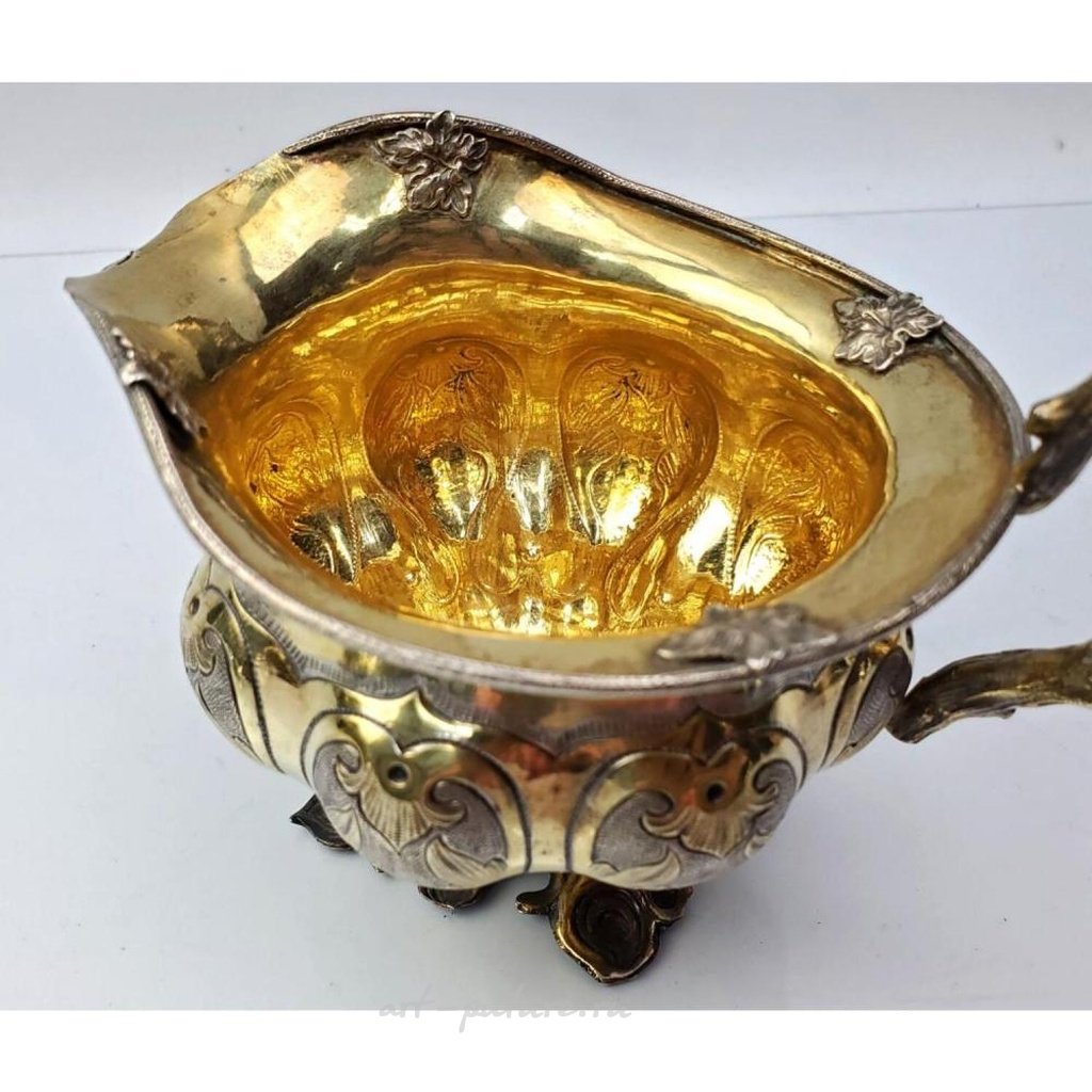 Антикварная русская сливочница в стиле арт-нуво. Полностью клеймована. Состояние: отличное. Размеры: высота - 4", от ручки до носика - 6.25". Вес: 6.69 тройских унций / 208.1 грамма. Происхождение: из дома на Лонг-Айленде, Нью-Йорк.