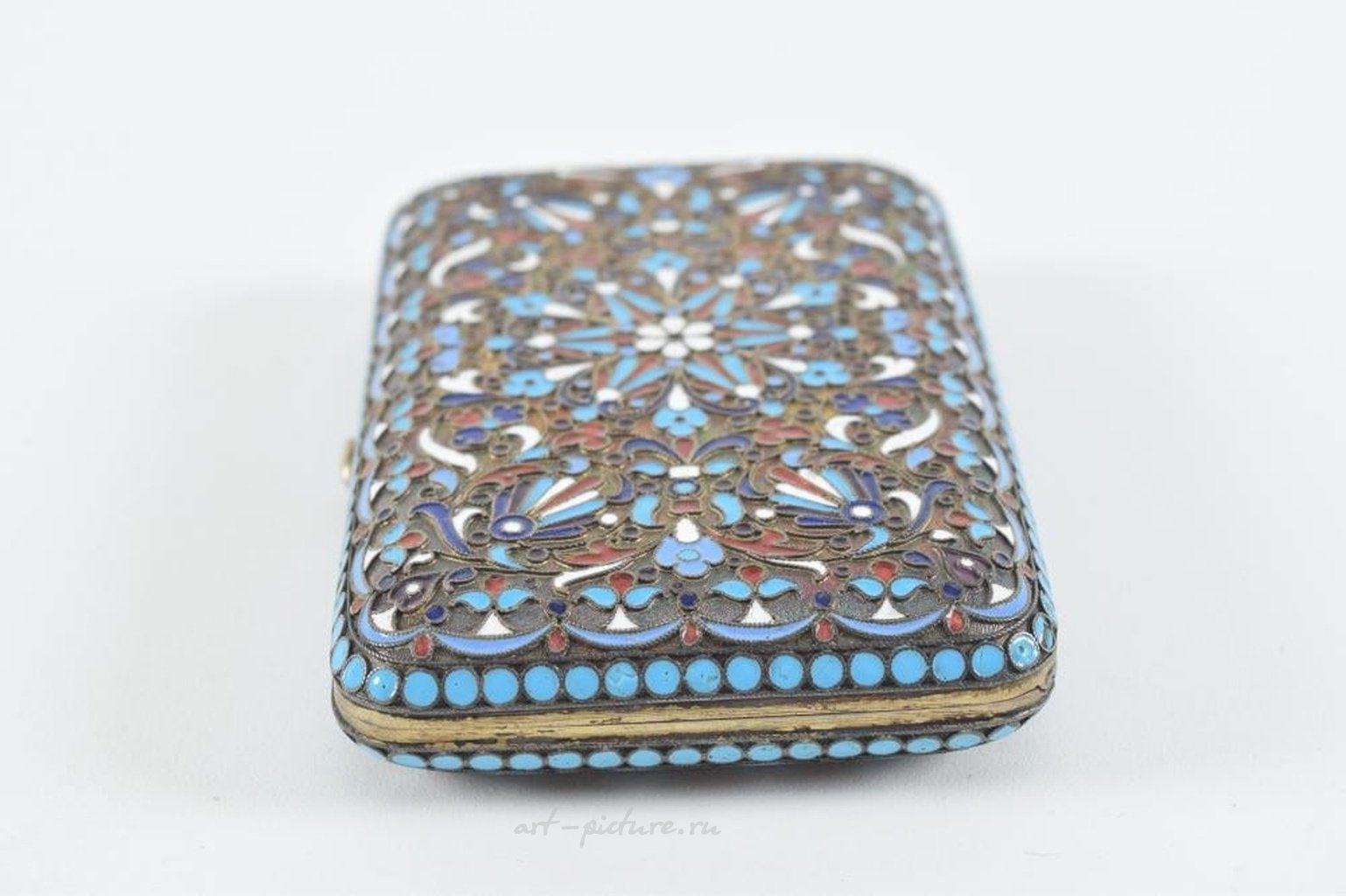 Конец 19-го/начало 20-го века русский серебряный эмалированный сигаретный кейс. Рельефная декорация в виде завитков с темно-синим, светло-синим, белым и красным эмалевым покрытием. На крышке имеется клеймо "кокошник" (1896-1908) и клеймо производителя (ГК? на кириллице). Размеры 4,25 x 2,75 дюйма. Вес 5,8 тройских унций.