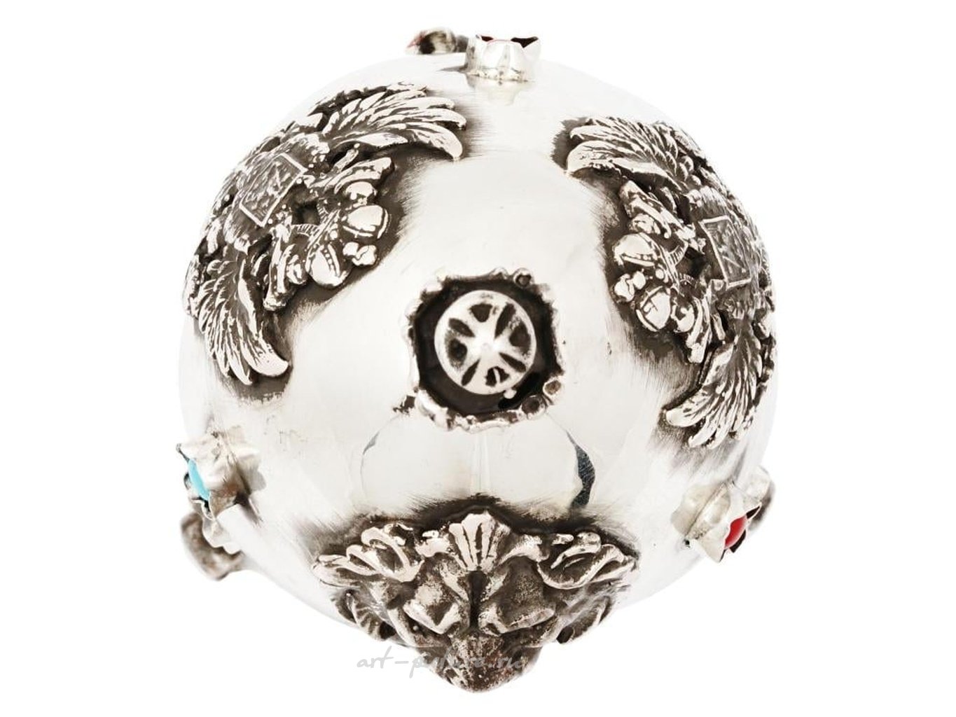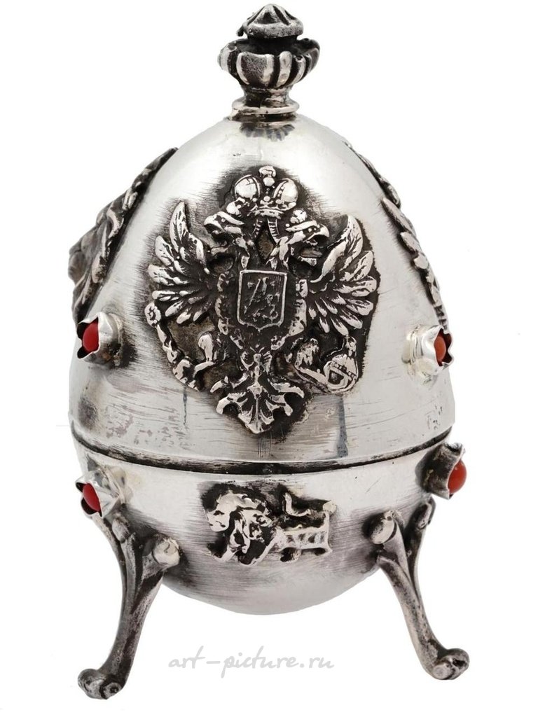 Русская покрытая серебром пасхальная шкатулка в виде яйца из 84 серебра. Внешняя часть коробки украшена рельефными изображениями львов, головами львов, парой двуглавых орлов императорского герба, гравированными деталями и фигурной крышкой, украшенной бирюзой и кораллами. Внутренняя часть яйца украшена фигуркой короны в открытом стиле, украшенной драгоценным камнем сверху. Установлена на трех фигурных ножках, выполненных из...