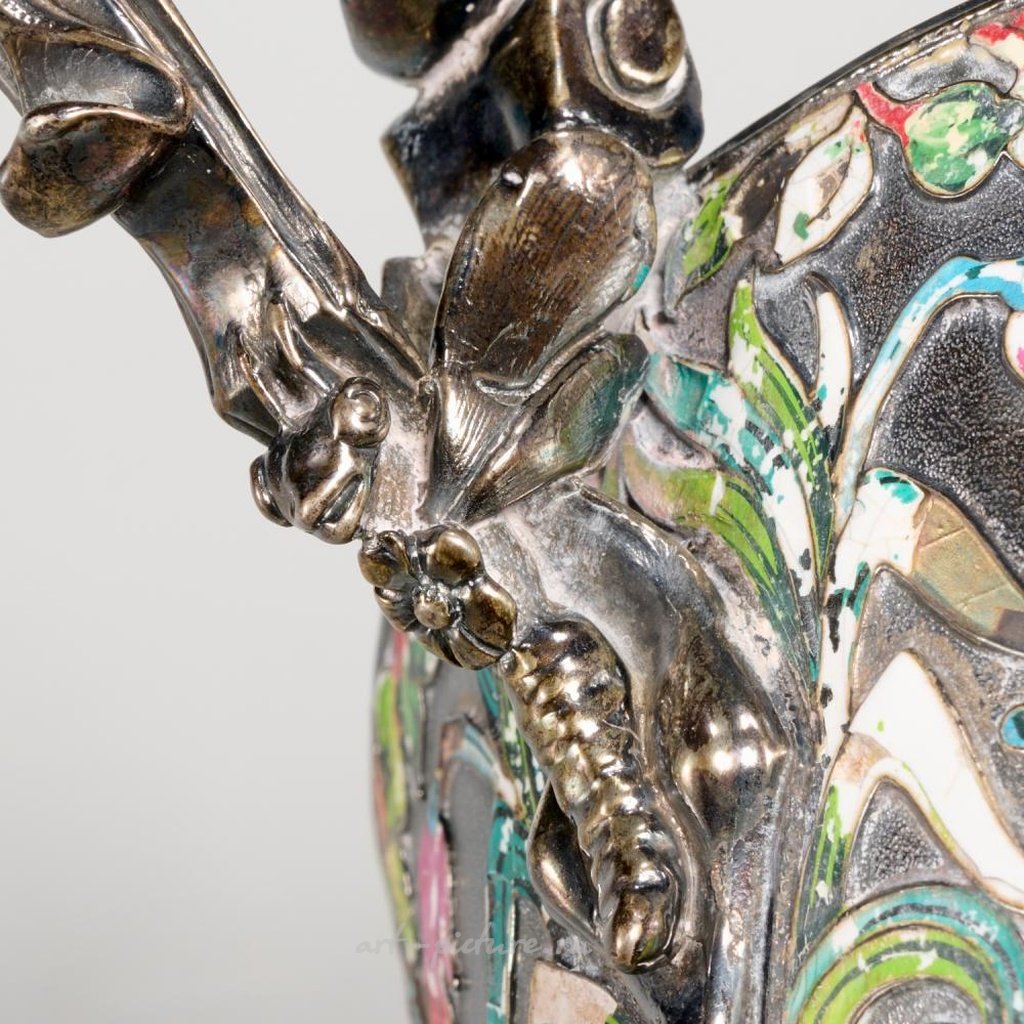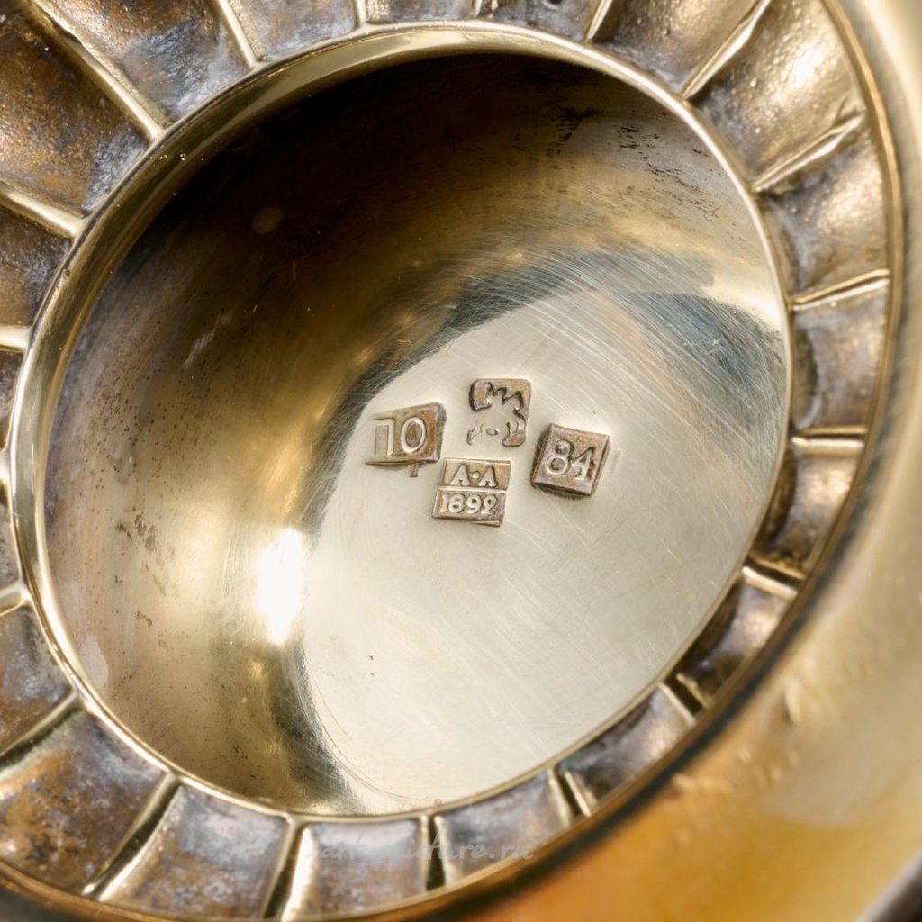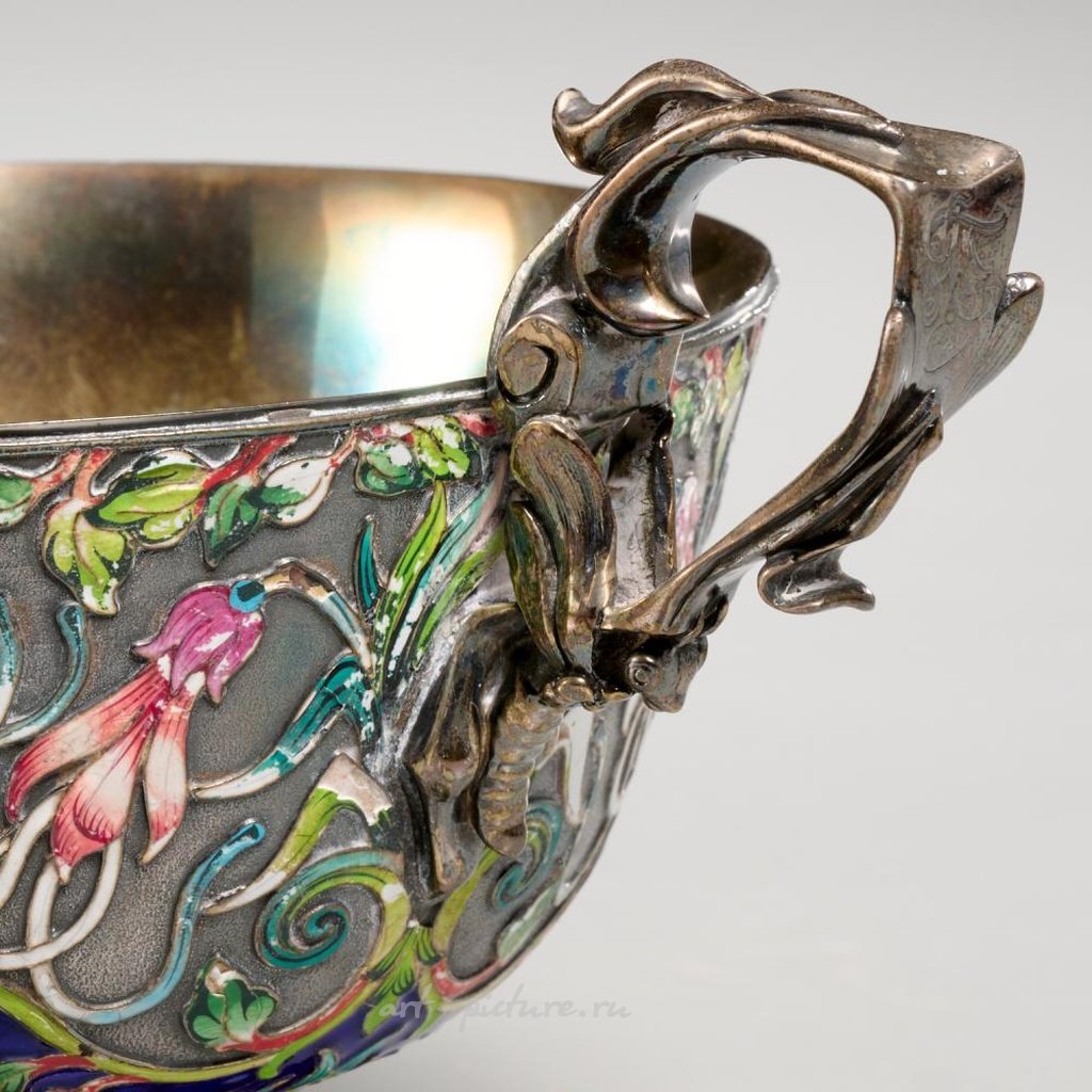 Датировано 1898 годом, Санкт-Петербург, полихромная эмаль на серебре 84 золотника, наружная чаша украшена эмалью с цветущими лозами, завершается двумя цветочными петлями, полные клейма на нижней стороне, размеры примерно 5"высотой x 9.5"длиной x 5.75"шириной, вес около 24.2 тройских унций.