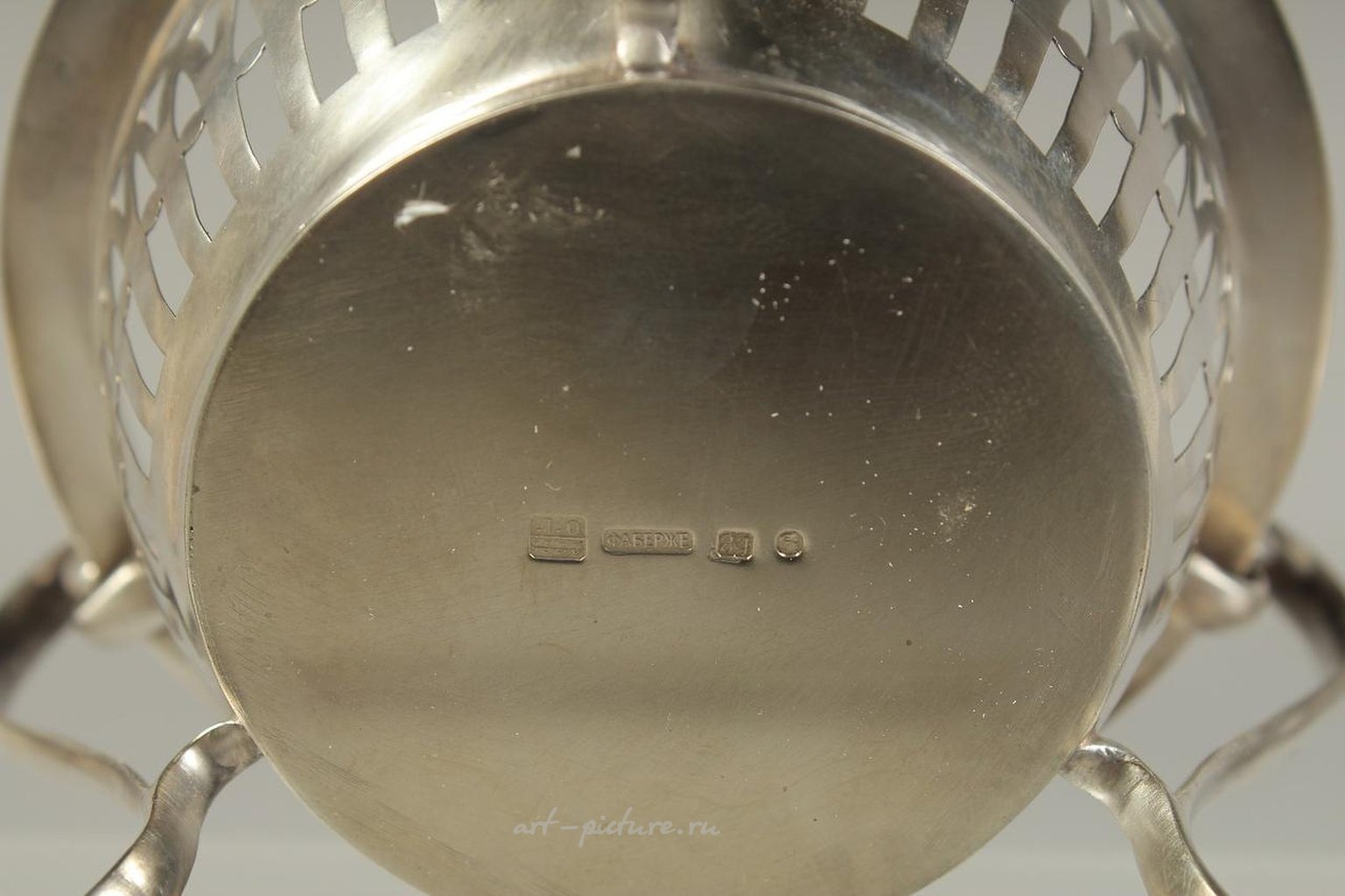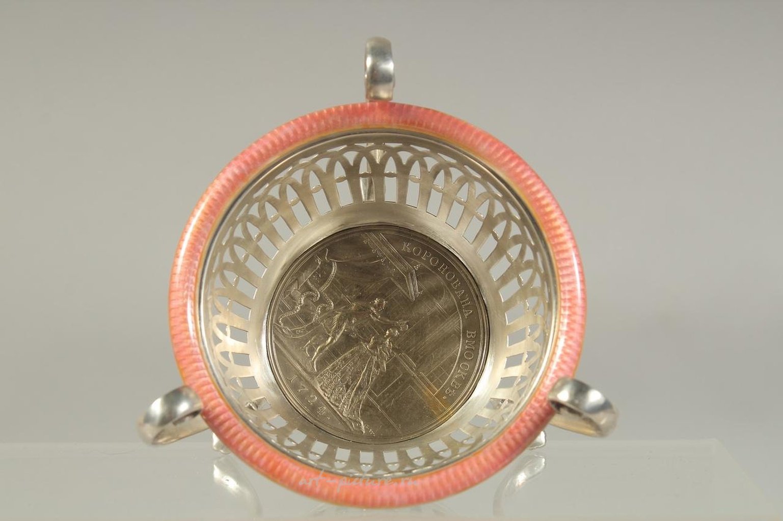 ЧАША ИЗ РУССКОГО СЕРЕБРА И РОЗОВОЙ ЭМАЛИ с медальоном на трех изогнутых ножках. Диаметр 3,5 дюйма. Имеет клеймо Фаберже