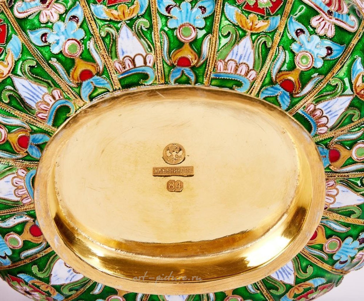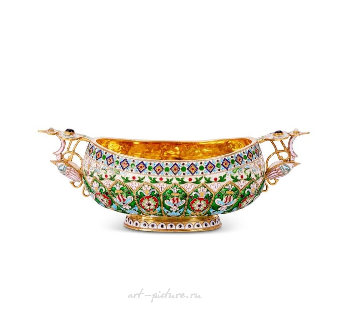 СЕРЕБРЯНЫЙ НАБОР С ПОЗОЛОТОЙ, ЭМАЛЬЮ И ДРАГОЦЕННЫМИ КАМНЯМИ "КОВШ В РУССКОМ СТИЛЕ" СЕРЕБРЯНЫЙ НАБОР С ПОЗОЛОТОЙ, ЭМАЛЬЮ И ДРАГОЦЕННЫМИ КАМНЯМИ "КОВШ В РУССКОМ СТИЛЕ" маленькая чаша с богатым орнаментом из цельного серебра с позолотой, с гильошированной эмалью и рельефной перегородчатой эмалью снаружи, внутренняя позолота, с двумя ручками, выполненными в виде стилизованных птиц и украшенными кабошонами, с поддельные марки, всего 250 граммов, 9