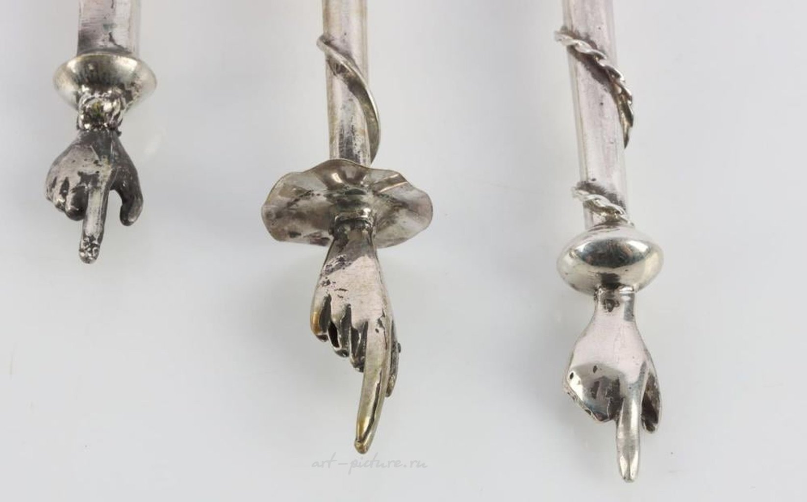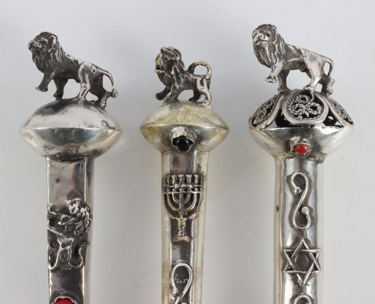 Лот из трех (3) указателей Торы. Все отмечены клеймом 84 для серебра .875. Годы, указанные на них, - 1873, 1878 и 1894. Длина составляет примерно от 6 до 6 1/2 дюймов. Вес в граммах следующий: 21, 18.6 и 17.7 грамма. Хорошее состояние с незначительным потускнением на одном из них.