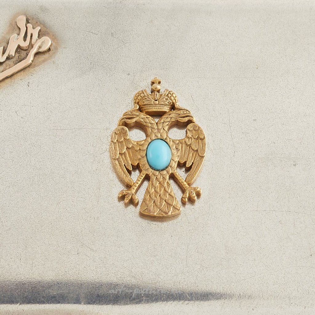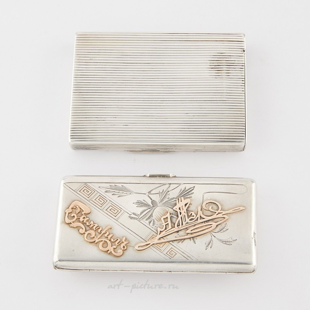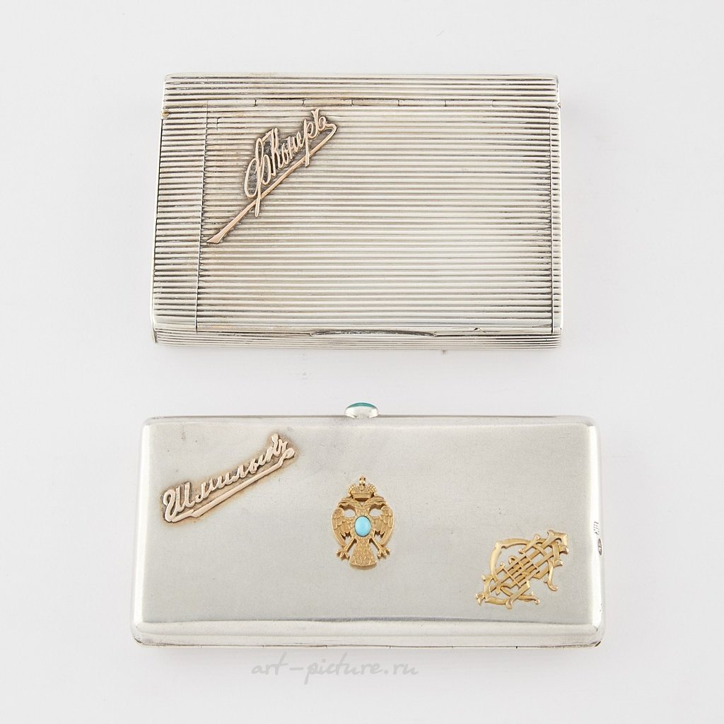 Пара русских серебряных сигаретных кейсов с нанесенными декоративными подписями. Один кейс с имперским орлом, вставленным кабошоном турмалина, и аналогичным кабошоном турмалина для кнопки закрытия. Кейс с турмалином маркирован "84" кокошником и мастерской в кириллице. Ребристый кейс маркирован кокошником и мастерской "КС", вероятно, Константин Скворцов (Москва, 1887-1908). Происхождение: Известная коллекция.