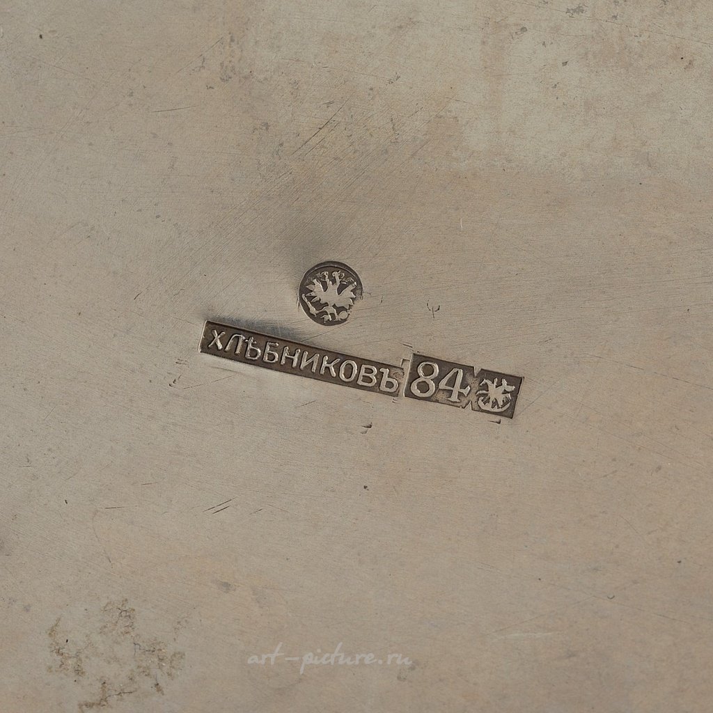 Русская серебряная чайная шкатулка. Моделирована по образцу луковой главы с изображением завитков листвы на пунктированном фоне. Внутренняя часть покрыта серебряной позолотой, а крышка с пробкой имеет ручку-кольцо для открывания. Внешняя крышка снимается. Под днищем имеются следующие отметки: мастерская Ивана Хлебникова (Москва, 1867-1871); гербовая печать Императорского двора; серебряная проба 84 золотника. Крышка и крышечка имеют отметку 84 золотника.