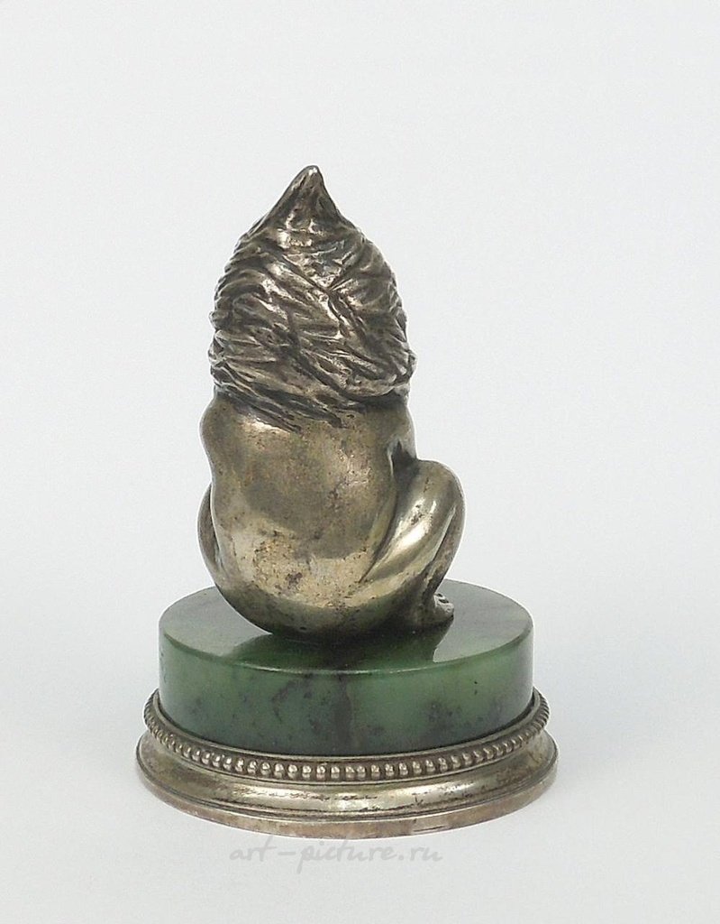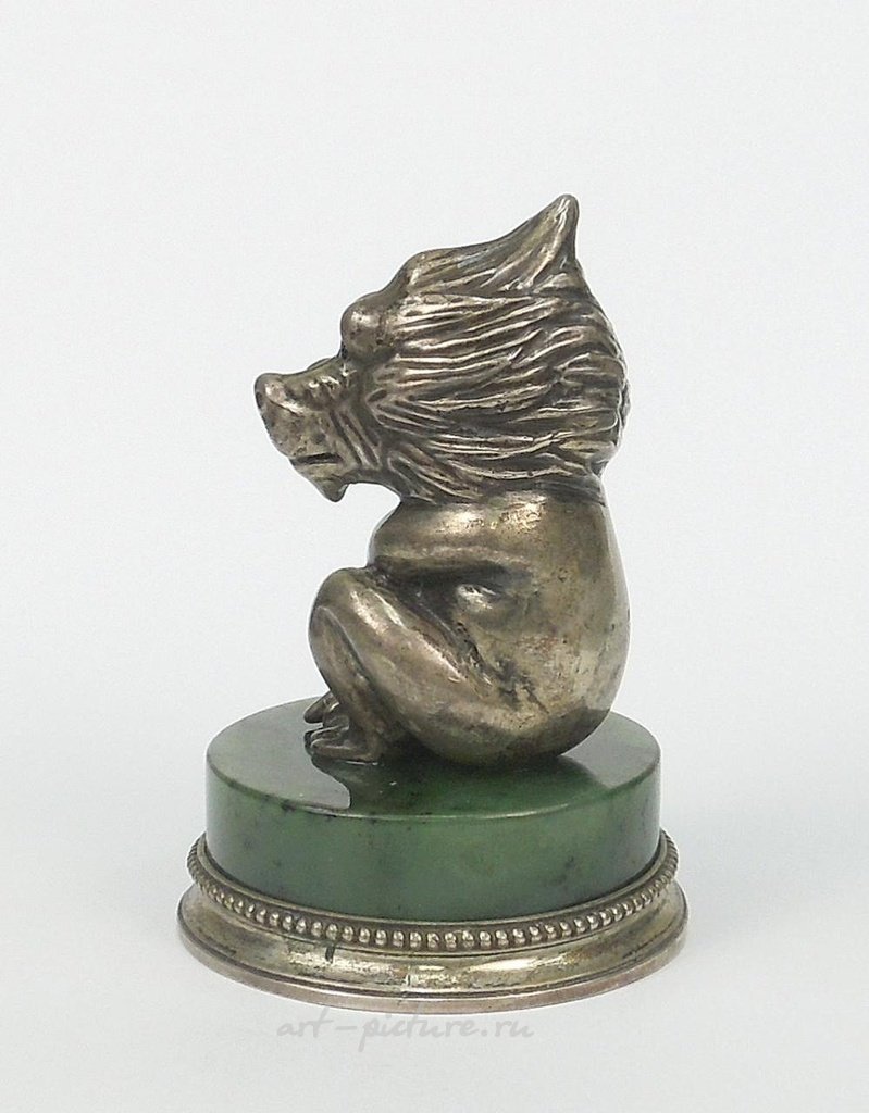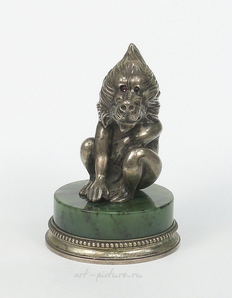 Русская серебряная фигурка бабуина Фаберже на зеленом мраморном и серебряном основании. Марка производителя Юлиуса Раппапорта на кириллице, марка серебра 84 (после 1908 года). С двумя бисерными глазами (один бисер заменен). Размеры 3 1/2" x 2 3/8".