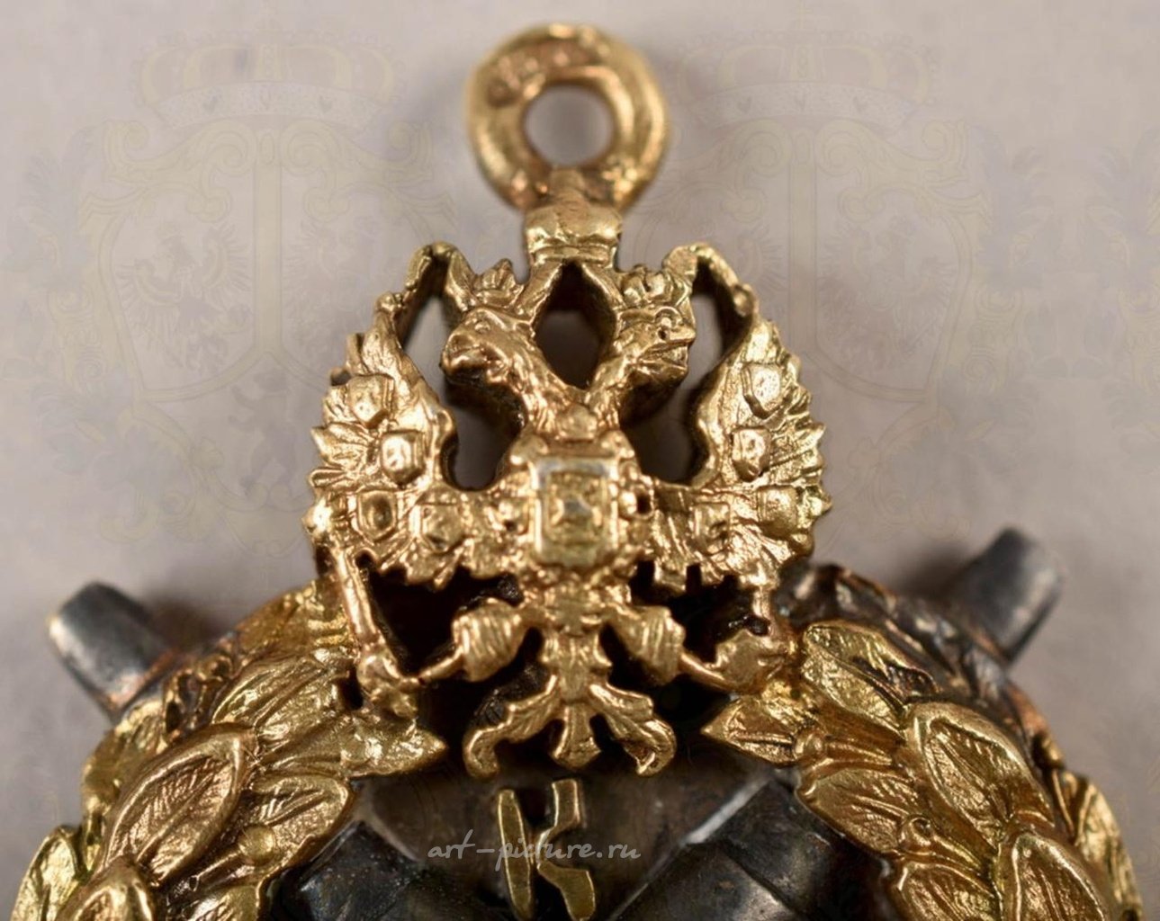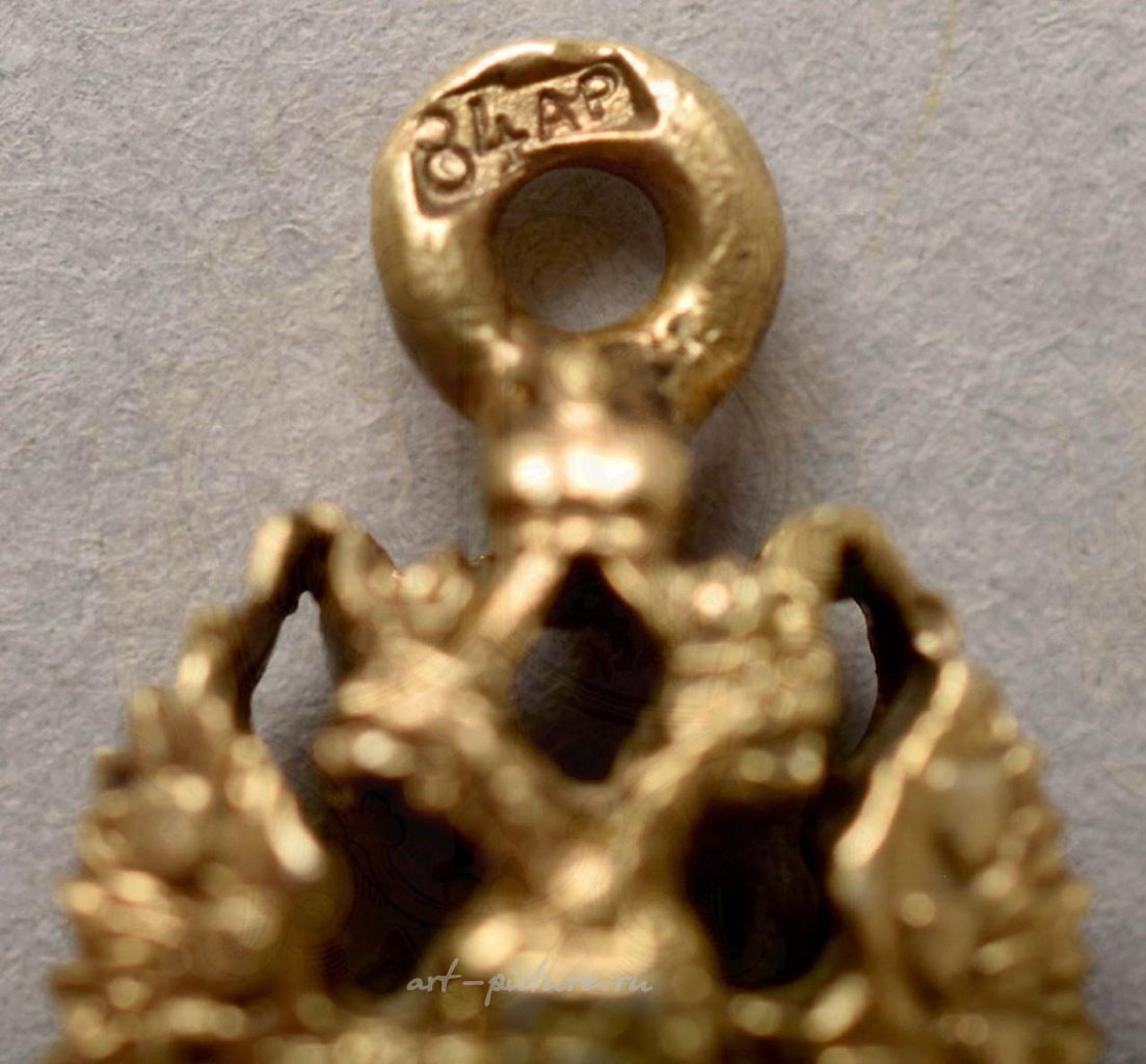 Значок артиллерии России, Царской империи, для артиллерийского офицера, серебряный/позолоченный, с кольцевым петлевым штампом "84 АП", многокомпонентная конструкция, на обороте с инициалами офицера и периодом службы 1904-1907 гг., размером 36x25 мм.