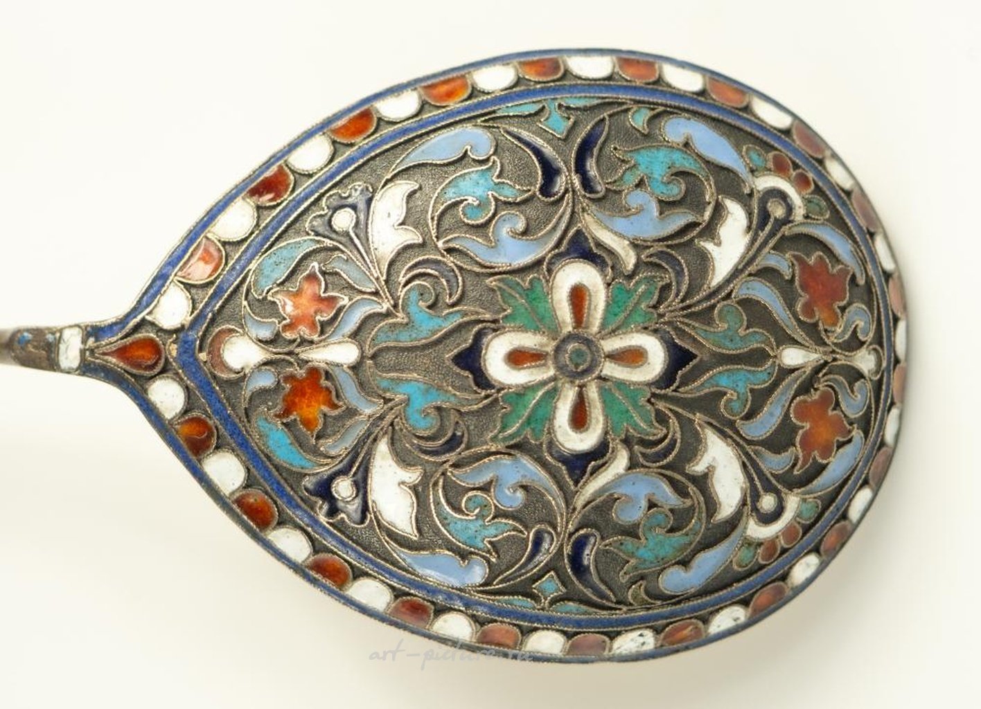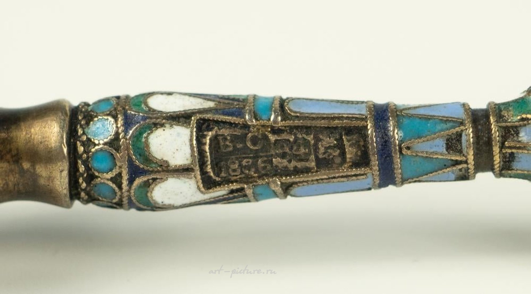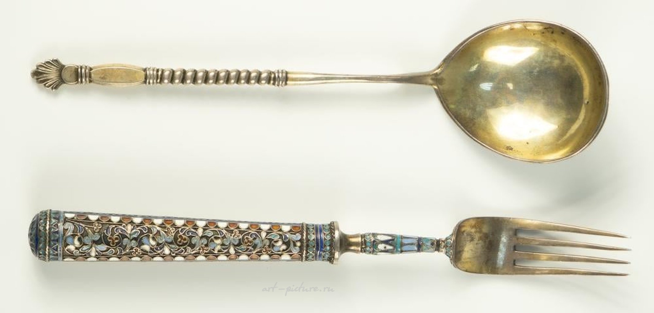 Русское серебро 84. Сканированная эмаль. Россия, Москва 1886 год. Общий вес 141 грамм. Длина ложки 19,3 см. Длина вилки 22,2 см.