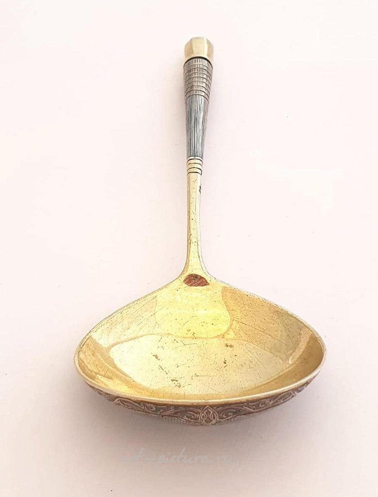 Русская серебряная ложка, конец 19 века. Подписана. Размеры: длина 17 см, ширина 6,5 см. Вес 205 г.