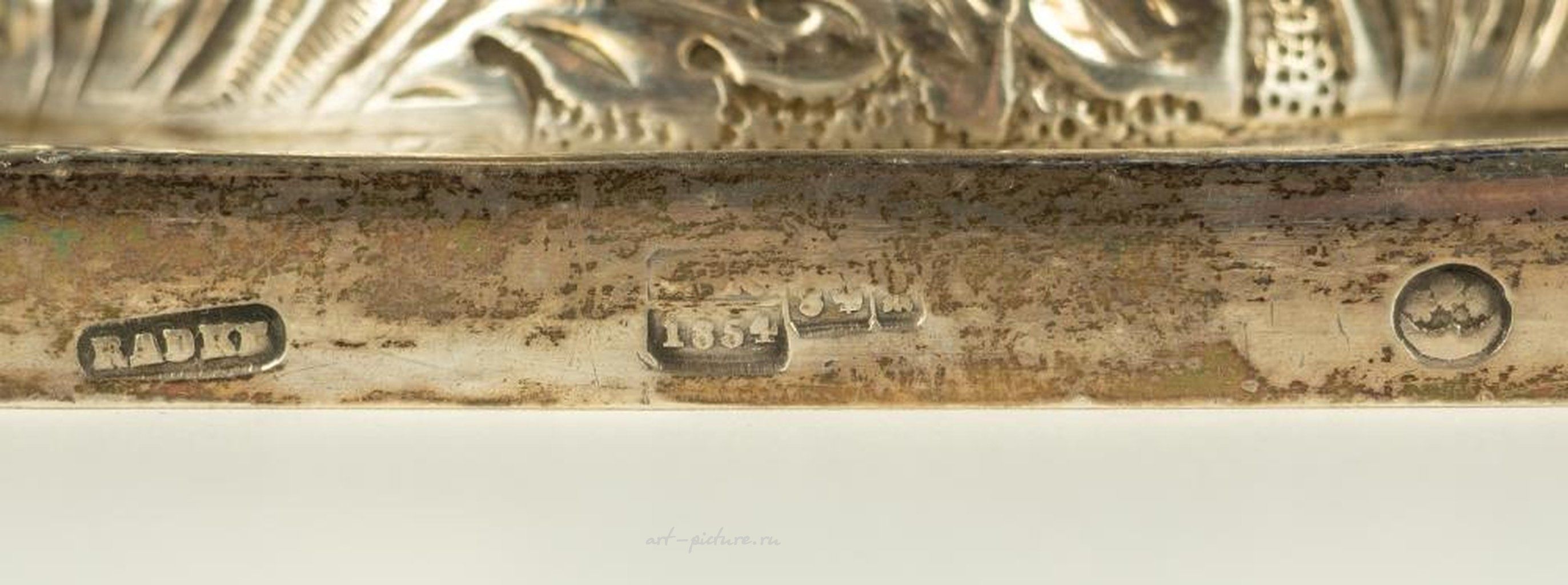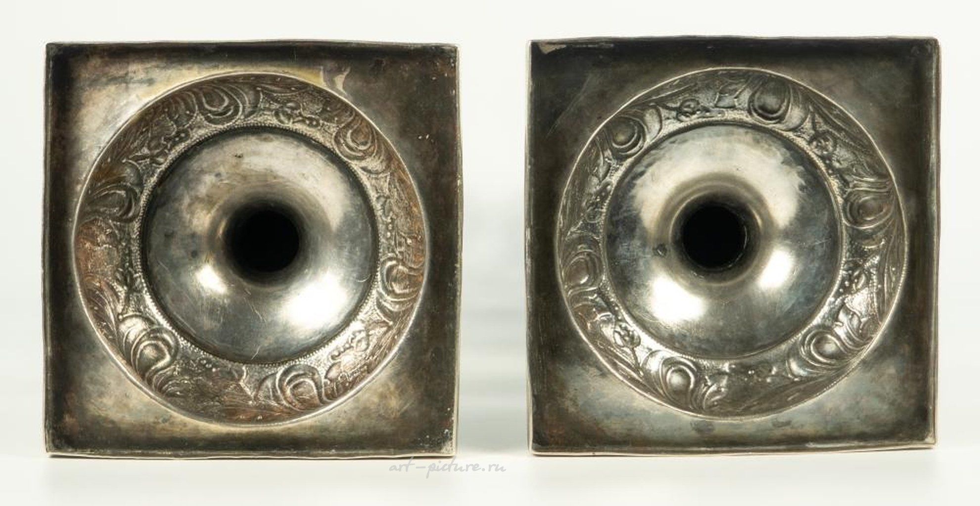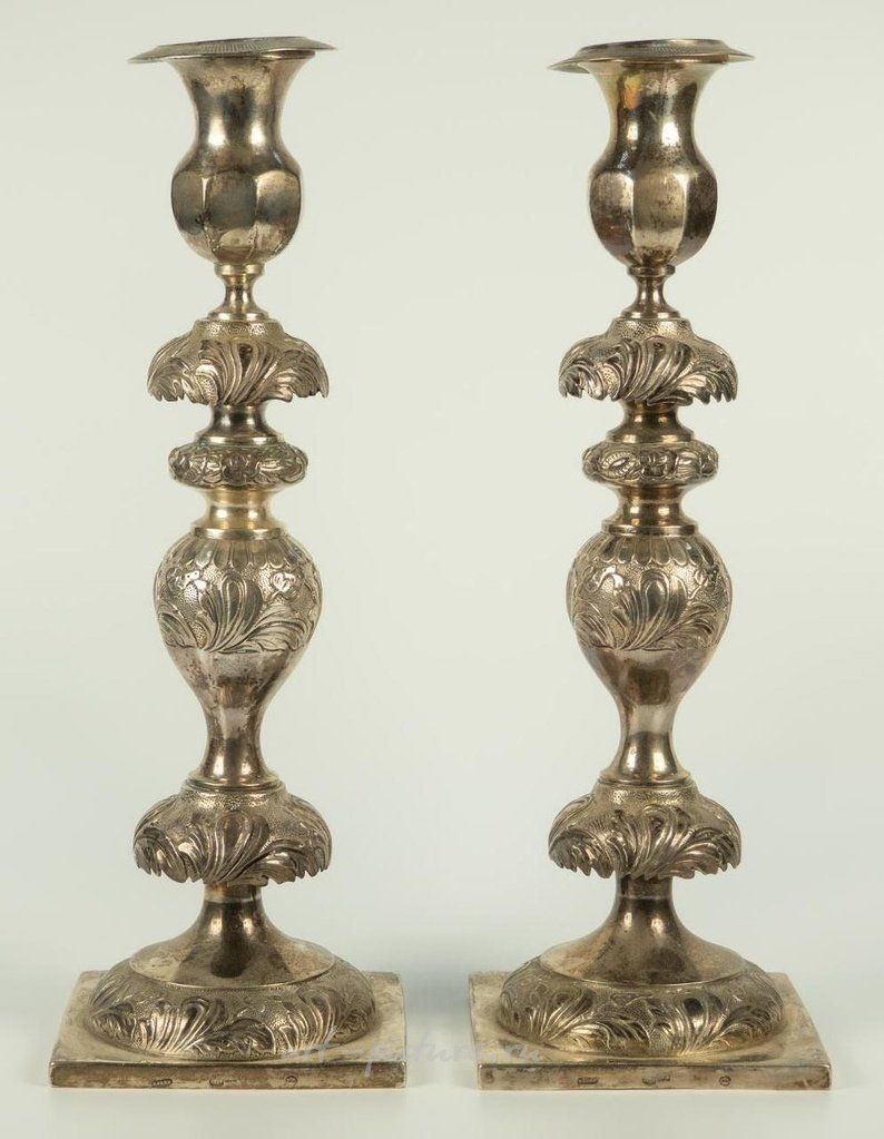 Серебро 84 пробы, гравюра, монтаж. Мастер "Радке". Российская империя, Минск, 1854 год. Общий вес 936 гр. Размер основания 11,3 * 11,3 см; высота 34,5 см.