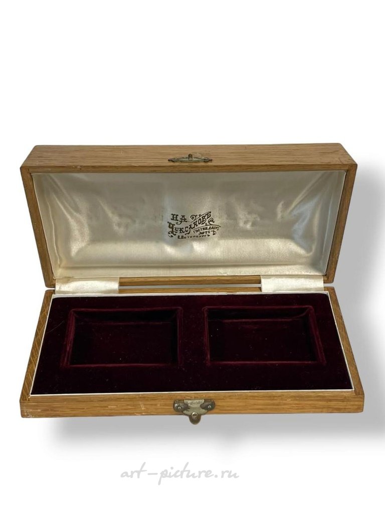 Санкт-Петербург 1899-1903 годы, мастерские пломбир Яков Ляпунов и Эрик Коллин. Длина 7 см, высота 4,8 см, ширина 2,8 см. Вес пары 166 г. Коробка размером 19,5х9,5х5,8 см.