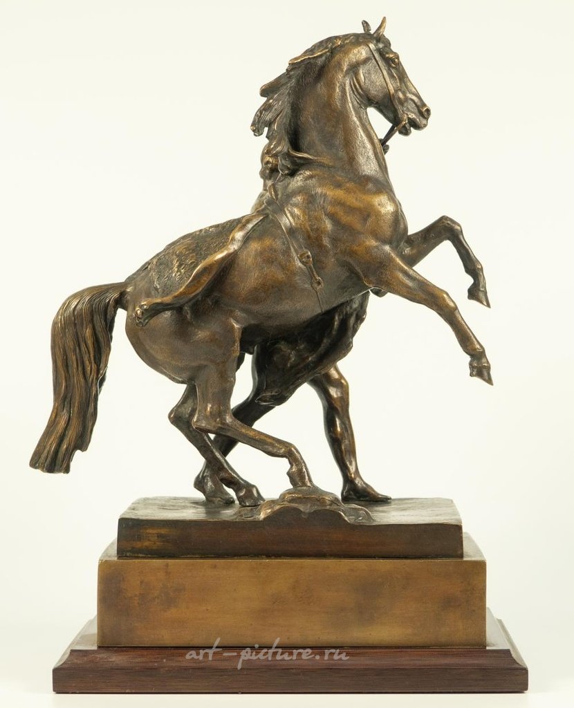 Россия, 20 век. Высота 35 см; основание 23,5*16,5 см. Одна из четырех скульптур ансамбля "Приручение лошади человеком" (Клодт П.К. 1841-1850) на Аничковом мосту. Барон Петр Карлович Клодт. Один из крупнейших русских скульпторов первой половины 19 века. Шведского происхождения, он вырос в семье высокопоставленных офицеров. Он занимался моделированием и отливкой крупных статуй под прямым наблюдением русского царя Николая I. В 1838 году он стал руководителем Императорской литейной мастерской (Императорская литейная мастерская). Он также моделировал и отливал несколько небольших групп, бюстов и статуй.