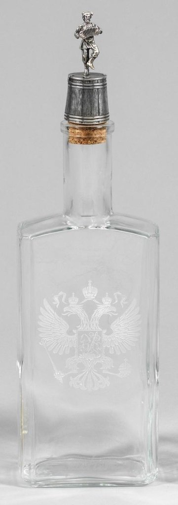 Бесцветное стекло и серебро. Прямоугольная бутылка с закругленными углами. На передней стороне рельефный герб Российской империи, изображающий двуглавого орла и Святого Георгия, убивающего дракона. Наверху фигурная водочная рюмка в виде танцующего музыканта на бочке. Внутри позолочено. Маркировано клеймом 84. Общая высота 36,5 см. Высота рюмки 8 см. Бутылка для водки из стекла с русским