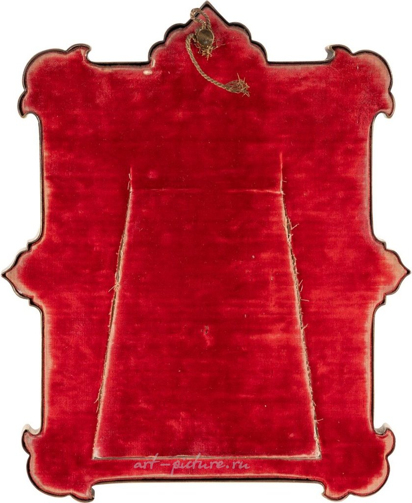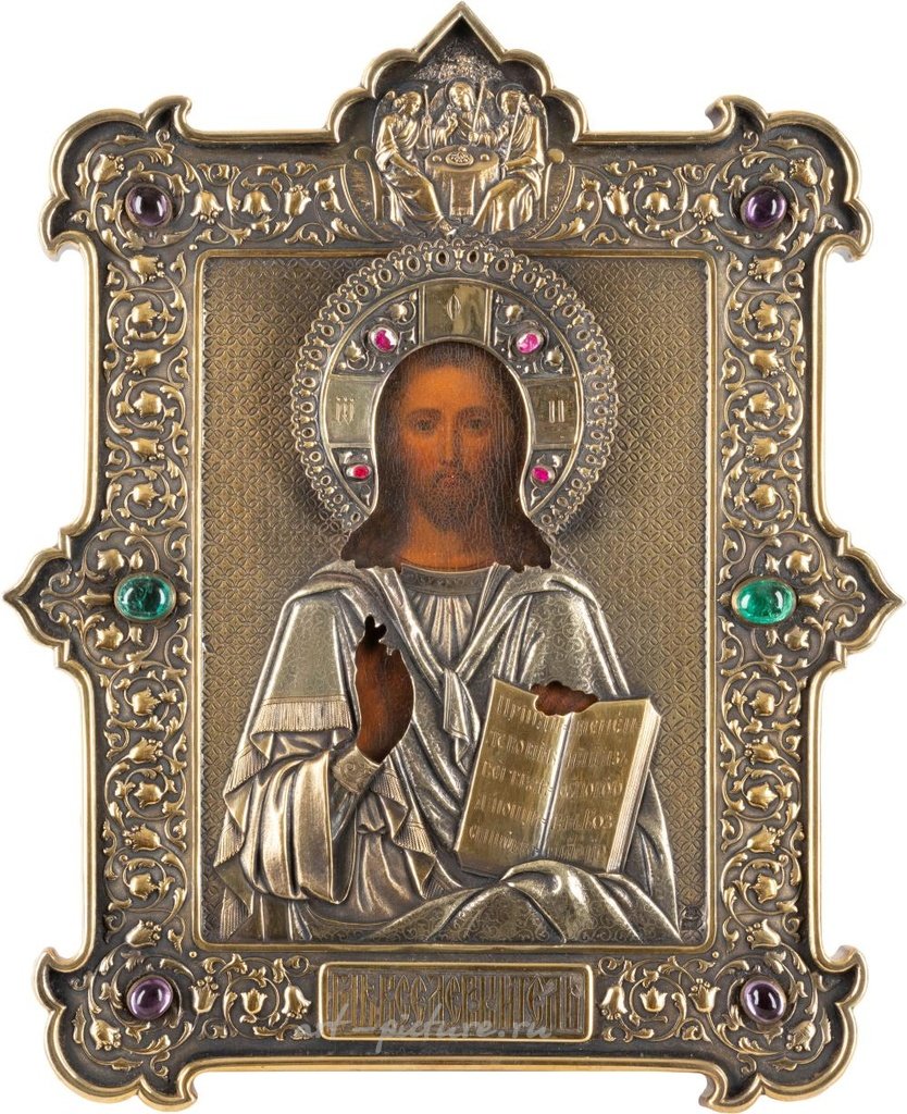 ОЧЕНЬ КРАСИВАЯ ИКОНА, ПОКАЗЫВАЮЩАЯ ХРИСТА ПАНТОКРАТОРА С ЮВЕЛИРНЫМ СЕРЕБРЯНО-ЗОЛОТЫМ ОКЛАДОМ В ОРИГИНАЛЬНОМ ФУТЛЯРЕ Русская, середина 19 века (икона), русская, Москва, Сазиков, 1856 год (оклад) Масло на деревянной панели с бархатной задней частью. Перекрытая очень красивым серебряно-золотым окладом, украшенным аметистами и изумрудными кабошонами. Поднятая граница украшена повторяющимися листовыми свитками,