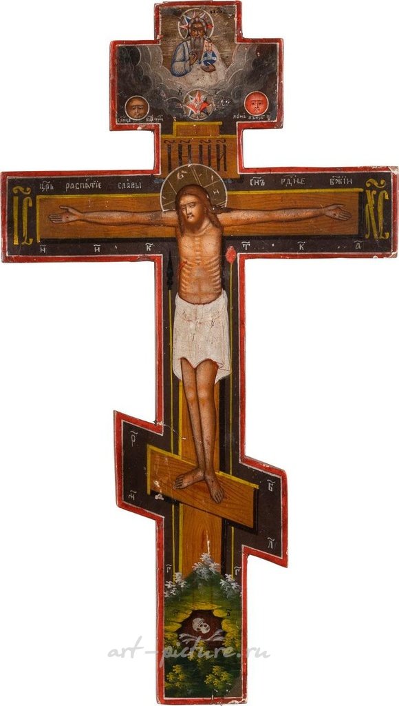 КРЕСТ Русский, середина 19 века. Темпера на дереве. Ореолы изготовлены из серебра, покрытого золотым лаком. Минимально восстановлено. Размеры 35,8 x 20,3 см. КРЕСТ Россия, середина 19 века. Яичная темпера на меловой грунт на дереве, частичное серебрение, покрытое золотом. Размеры 35,8 x 20,3 см. Мин. восст.