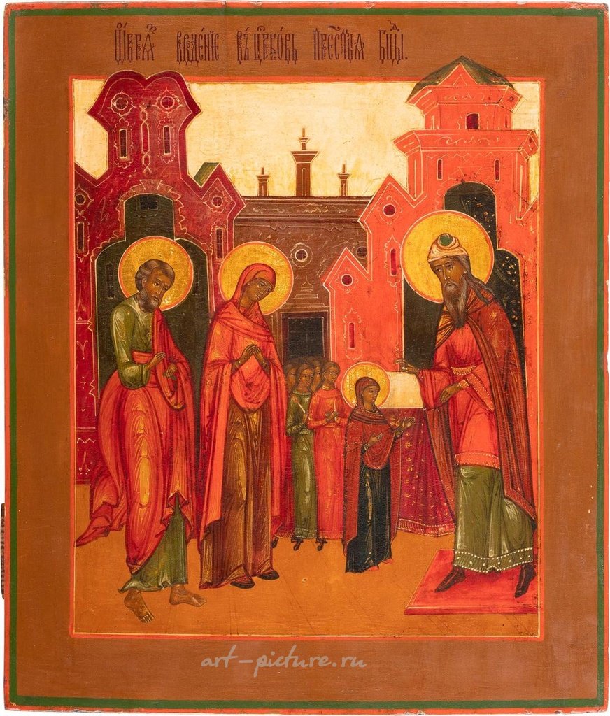 Икона, изображающая Вход Пресвятой Богородицы в Храм. Русская икона, около 1800 года. Темпера на деревянной панели. Ореолы изготовлены из серебра, покрытого золотым лаком. Фон очищен до гипса, минимально восстановлен. Размеры 35 x 30 см. Икона с изображением Ходы Богородицы в Храме. Русская икона, около 1800 года. Однопанельная с двумя профилированными задними шпонками. Яичная темпера на меловом грунте, серебряный ореол.