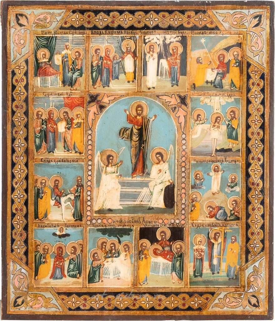 Икона, изображающая Воскресение Христа в окружении двенадцати главных праздников. Россия, около 1900 года. Темпера на деревянной панели. Граница выполнена из серебра, покрытого золотым лаком. Границы орнаментально вырезаны и расписаны под имитацию эмали. Минимально восстановлена. Размеры 30,4 x 26,3 см. Икона праздника с Воскресением Христа и двенадцатью основными праздниками. Россия, около...