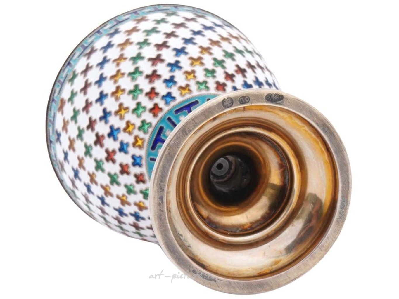 Высоко ценится русское серебряное яйцо, состоящее из двух соответствующих частей, нижняя часть поднята на стебель, установленный на круглой основе. Украшено узорами из эмали плике-а-жур на корпусе и эмалировано в технике клузоне. Внутри имеет позолоченное покрытие. Верх украшен гранатовым камнем. Отмечено маркировкой производителя и пробирными марками серебра 84. Техника эмали плике-а-жур предполагает нанесение эмали на мембраны тонким слоем, создавая светопроницаемость.