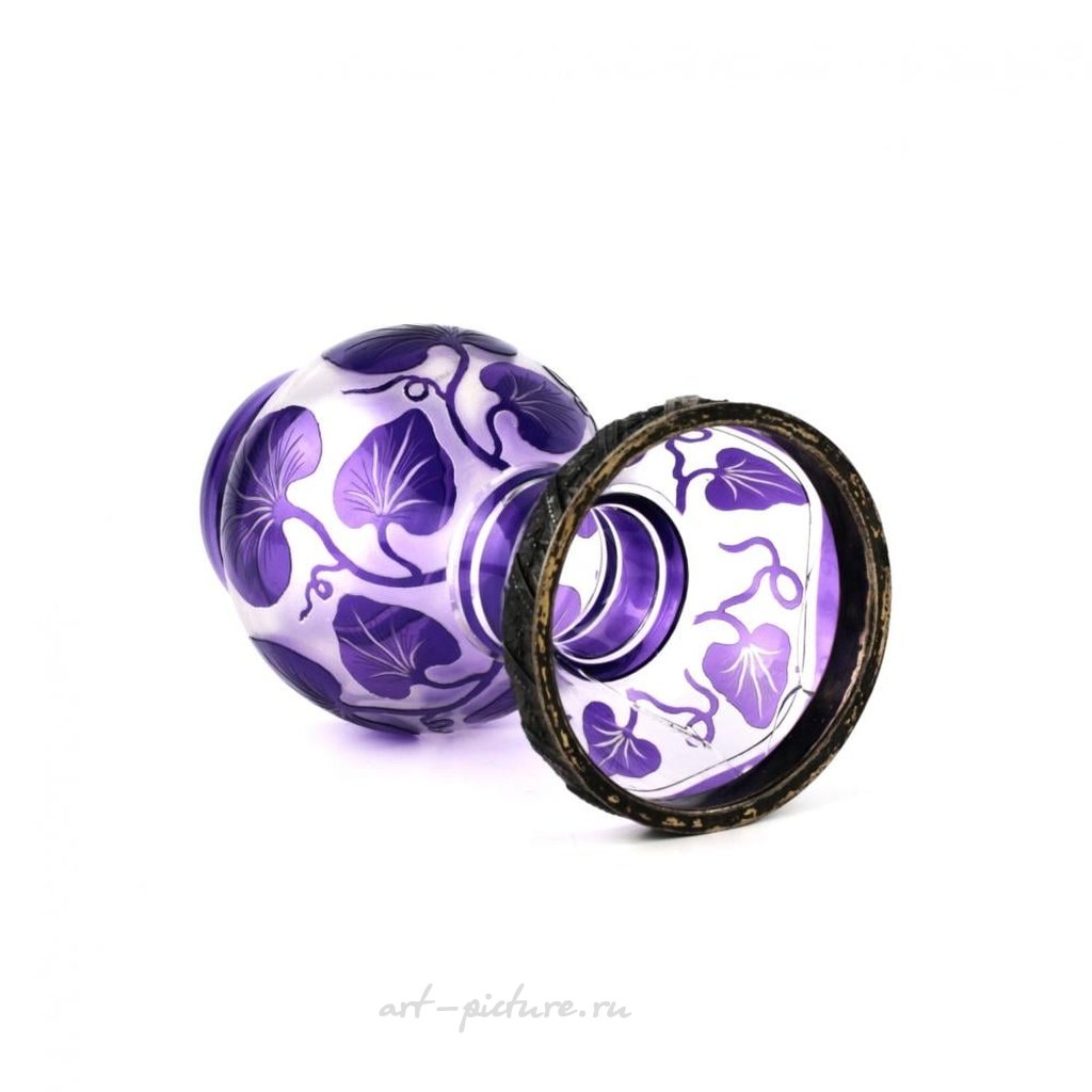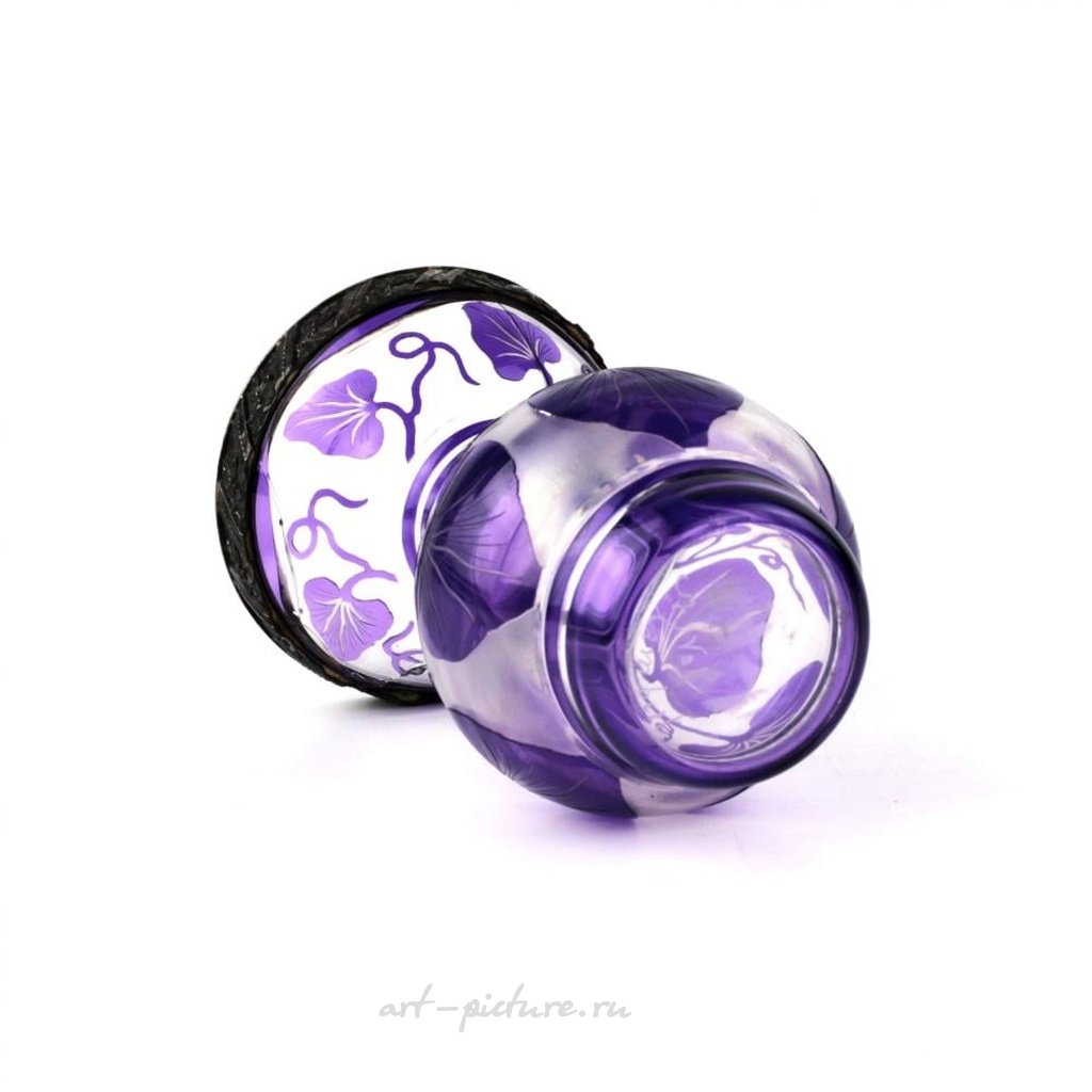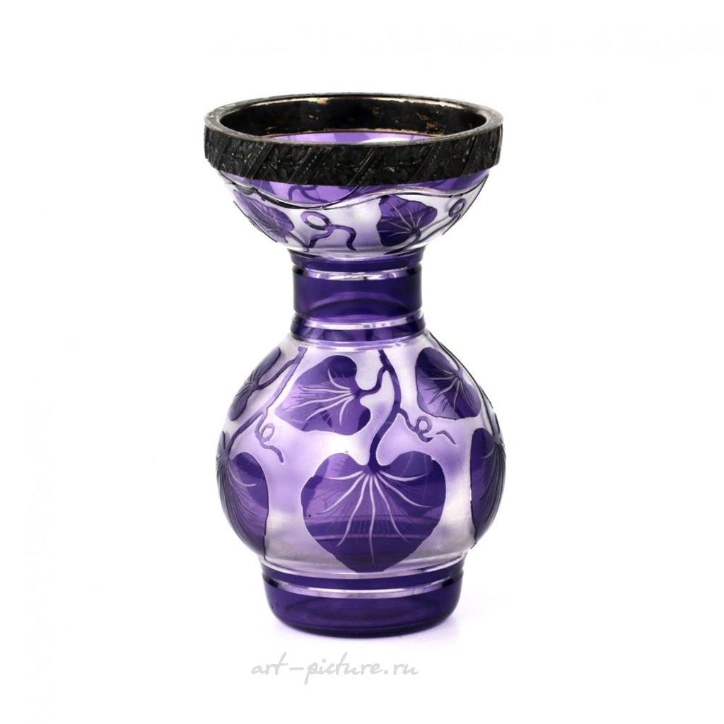 Ваза из многослойного стекла "Вьюнок", с серебряным ободком 84 пробы. Маркировка: табличка "А.Х.". Царская Россия. Начало двадцатого века. Высота 12,5 см. Восстановление стекла. Общий вес: 217 гр. Ширина: 8 см, Высота: 12,5 см, Глубина: 8 см, Вес: 0,217 кг, Состояние: Предыдущее восстановление, Материал: Серебро 84, Стекло.
