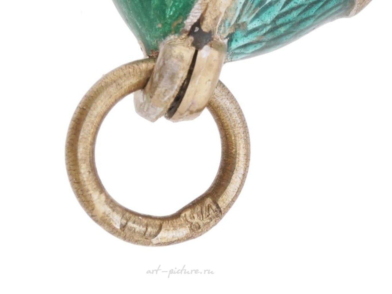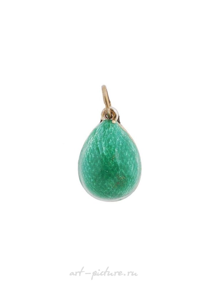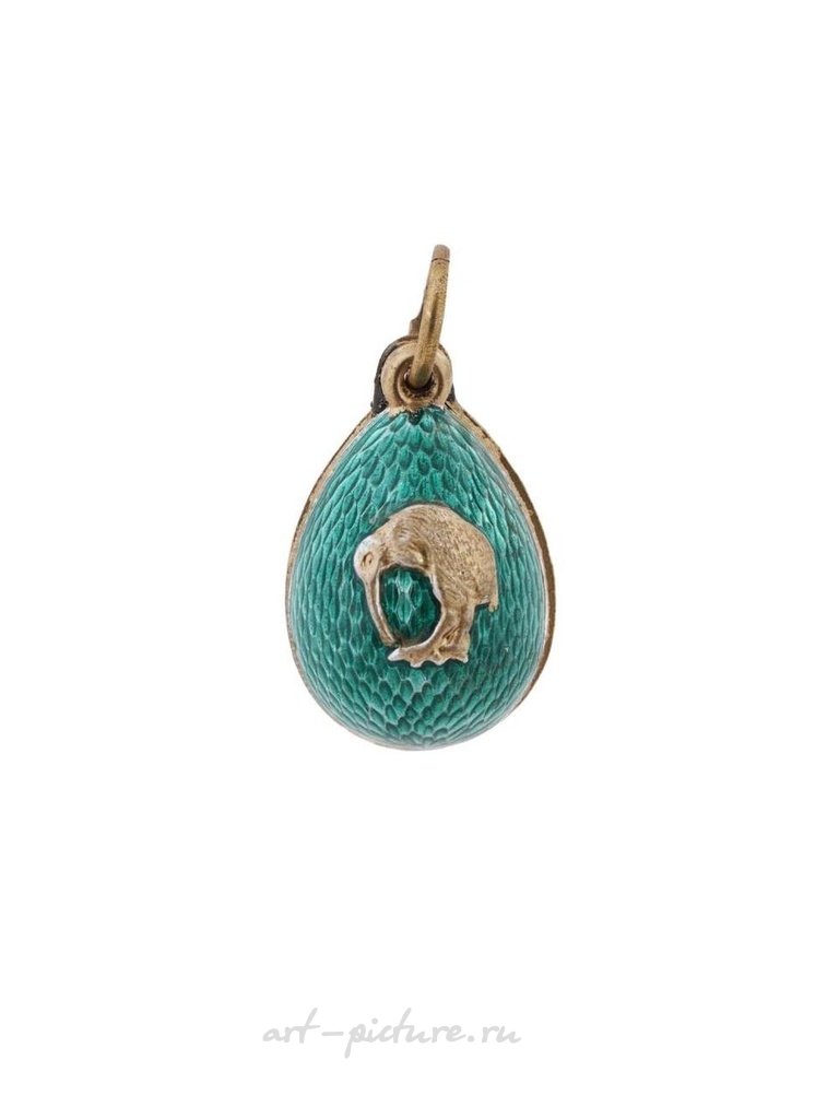 Русская серебряная и эмалевая подвеска в форме пасхального яйца. Внешняя часть яйца покрыта гильошированной эмалью в изумрудно-зеленом оттенке и украшена позолоченным серебряным орнаментом в виде птицы-бекаса. Отмечено стандартным русским серебряным клеймом и клеймом изготовителя на подходящем кольце. Общий вес: 6 г. Русское серебряное ювелирное изделие и аксессуары для коллекционеров.