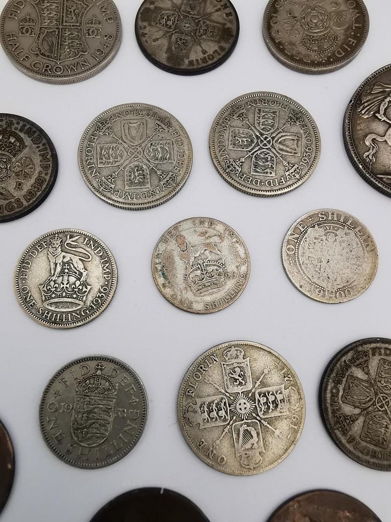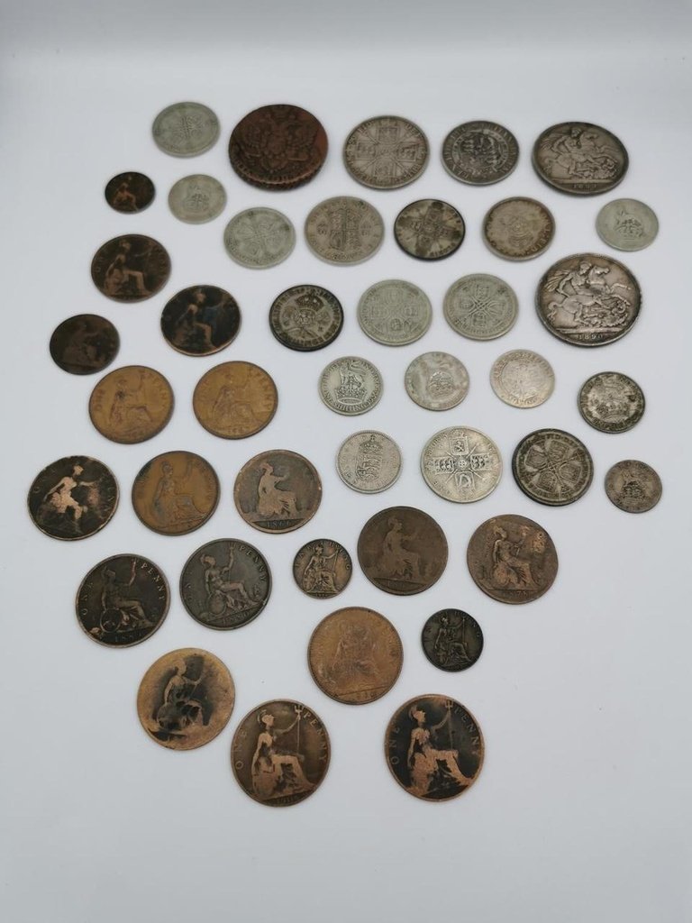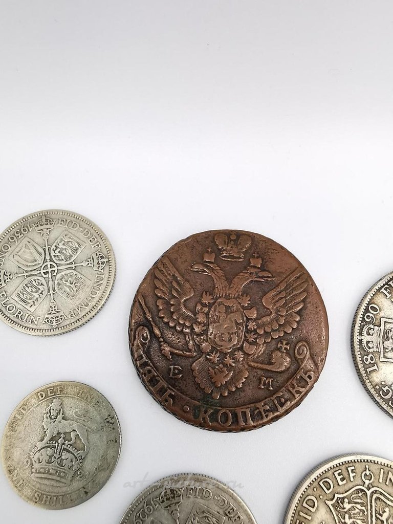Коллекция британских и мировых монет, включая некоторые серебряные. В том числе бронзовая русская монета 5 копеек.