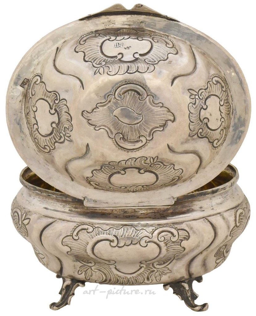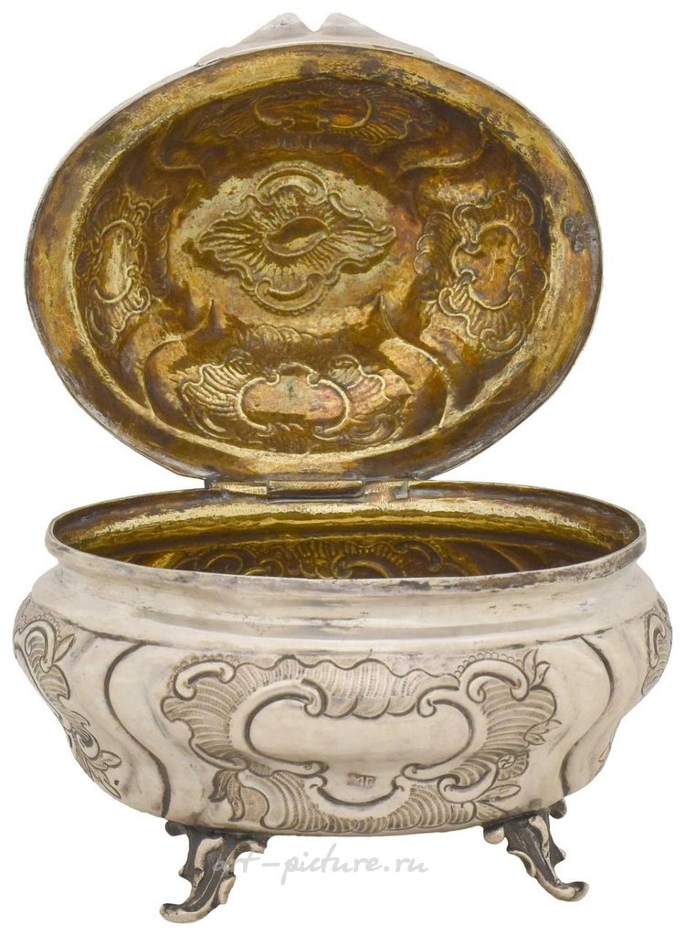 Русский серебряный ковчег, бонбоньерка в стиле рококо. - Россия, 18 век (?) - 13x11x10 см; 305 г. Серебро; литье, гравировка, позолота. Маркировка: герб города Москвы - город испытания, инициалы ассея "АА" (Андреев Андрей?) с датой "1777", марки мастеров "ВМ" и "МГ". Состояние: по запросу.