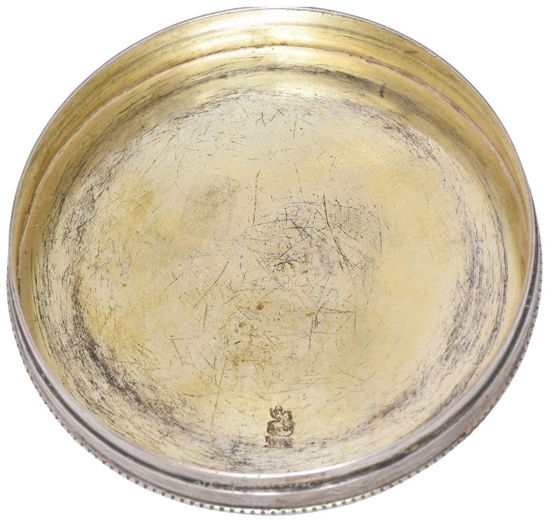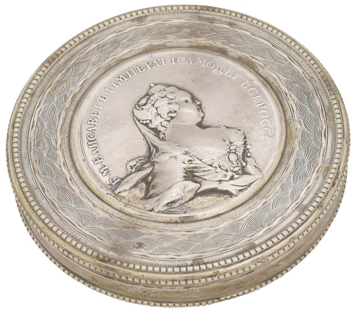 Серебряная русская табакерка с отпечатками медали "В память о смерти императрицы Елизаветы I Российской". - Россия, 18 век (?) - 9,5x2 см; 241 г. Серебро; клеймо, гравировка, позолота. Клейма: герб города Москвы - город осмотра, с датой "1790" (?). Состояние: по запросу.