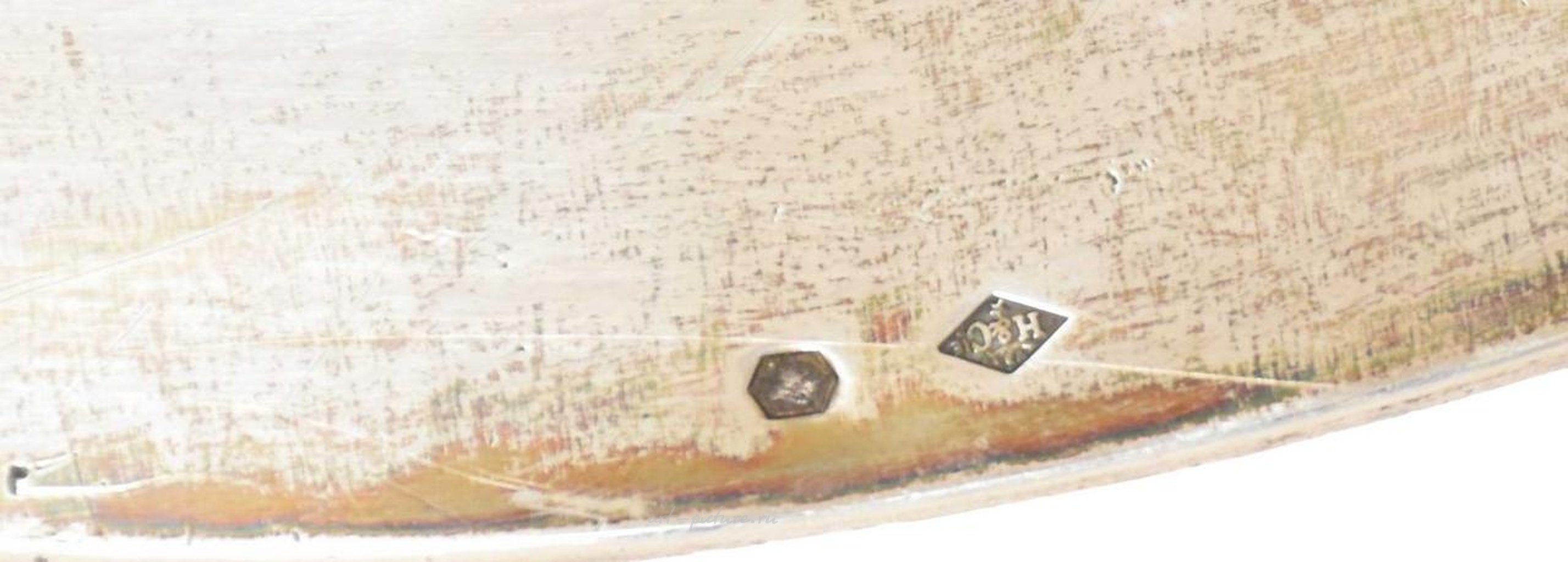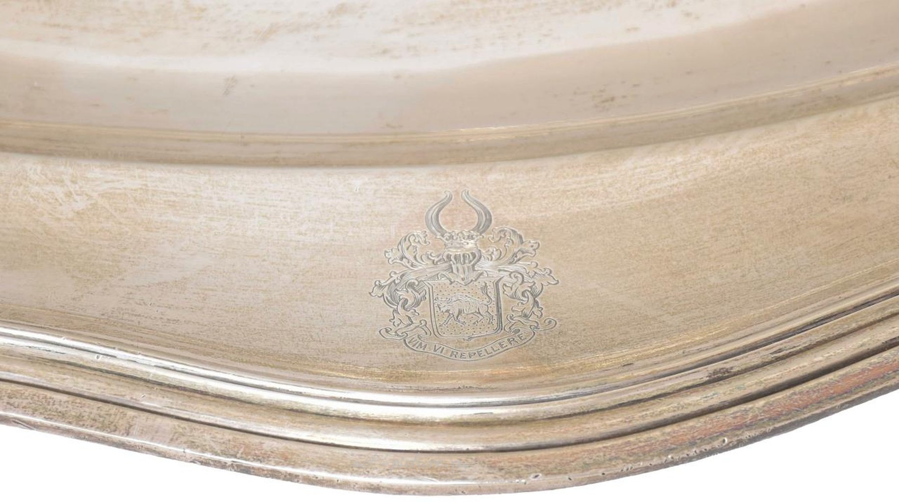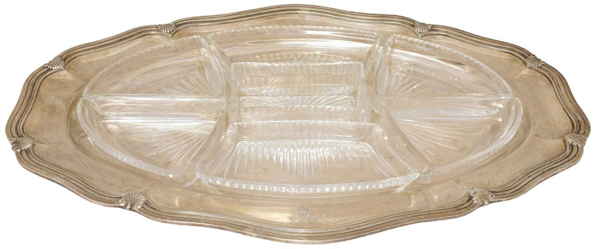 Набор для менажа на серебряной табличке с гербом русской дворянской семьи. - Франция, Henin and Cie, 19-20 век. - 21x29x7 см; 2300 г. Серебро; литье, гравировка. Стекло. Маркировка "Голова Минервы", марка мастера "H and Co". На краю боковой стороны находится герб русской дворянской семьи Приватного Советника Николая Тура. Девиз на ленте: "