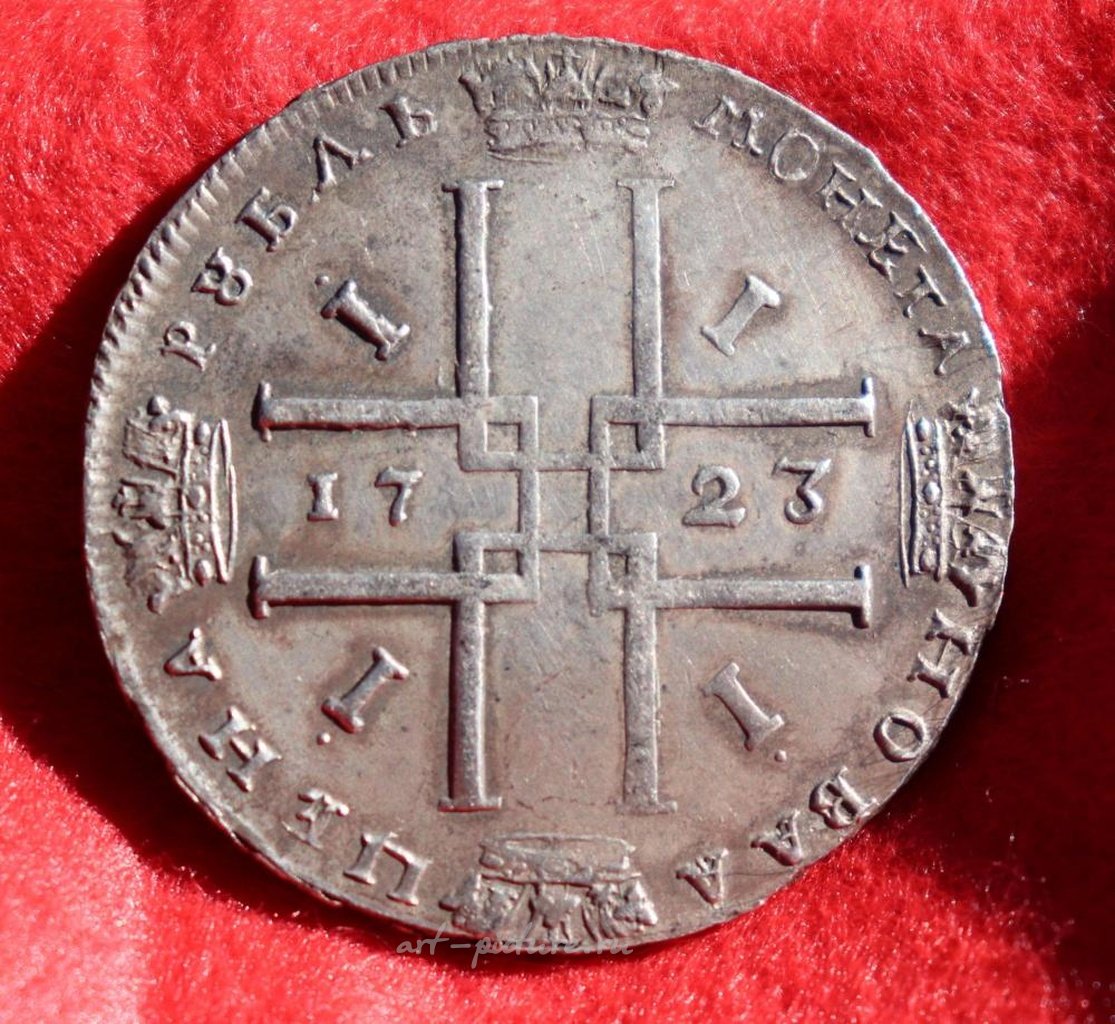 рубль Петра Первого 1723 года, "Портрет в древней броне". Номинал 1 рубль 1723 года "Портрет в древней броне". Надпись на краю - Серебро. Диаметр: 39 мм; Вес: 27,94 г; Пётр Великий (русский: Пётр Вели́кий, транскрипция: Петр Великий, IPA: [ˈpʲɵtr vʲɪˈlʲikʲɪ])