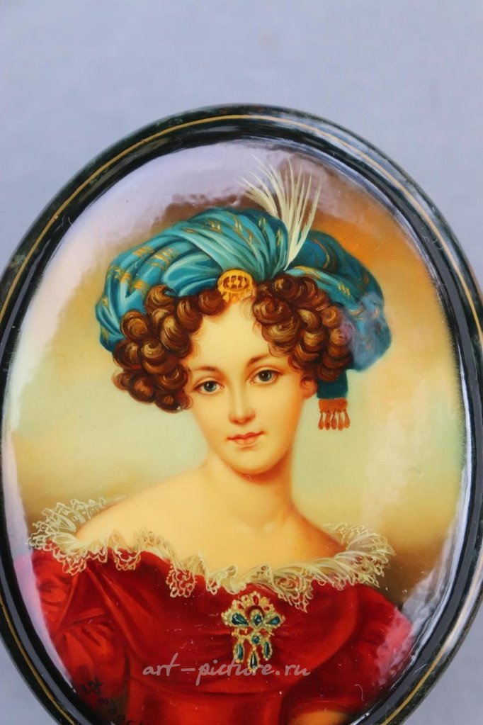Русская лаковая миниатюра Федоскино. Очень высокое качество миниатюрного портрета. Оригинальный художник П. О. Росси, написано в 1825 году. Художник миниатюрной копии: Королева, написано в 2000 году. Размер коробки: 62 мм x 80 мм x 40 мм = 6,2 см x 8,0 см x 4,0 см. Федоскинская миниатюра (русский: федоскинская миниатюра) - это традиционная русская лаковая миниатюра на папье-маше, названная в честь своего исторического центра - Федоскино (Федоскино), старой деревни недалеко от Москвы, широко известной с конца 18 века. Современная федоскинская живопись сохраняет типичные черты русского народного искусства. Использование масляных красок, обычно наносимых во многих слоях, является характерной особенностью федоскинской миниатюры, а также использование перламутра, чистого золота или серебряной фольги под отдельными сегментами фона, чтобы создать эффект мерцающего сияния или серебристого блеска. Многие коробки рисуются снаружи и внутри под имитацию черепахового панциря, бересты, махагони или тартана. Расцвет федоскинской миниатюры пришелся на вторую половину 19 века, и работы того времени известны как "лукутинские", названные в честь купцов Лукутинов, которые владели федоскинской фабрикой в то время. Петр Лутукин унаследовал фабрику в 1824 году, и она оставалась в собственности семьи до 1904 года. После небольшой паузы в руках бывших работников Лутукина ("Федоскинская артель бывших работников фабрики Лутукина") фабрика фактически прекратила свою деятельность до революции, когда в 1923 году изделия Федоскино были награждены дипломом за "великолепное художественное мастерство" на Всесоюзной выставке сельскохозяйственных, промышленных и культурных товаров, которая прошла в Москве в том году. Некоторые мастера фабрики имели художественное образование, и многие из них происходили из иконописных мастерских. В 1931 году открытие профессиональной школы миниатюрной живописи в Федоскино обеспечило сохранение этой художественной формы, что позволило ей продолжать развиваться в последующие годы. Стилистически фабрика Федоскино отличается от других школ лаковой миниатюры: в частности, Палеха, Мстеры и Холуй. Популярные мотивы, используемые в федоскинской миниатюре, - это различные виды чаепития с самоваром, тройки и сцены из русской крестьянской жизни.