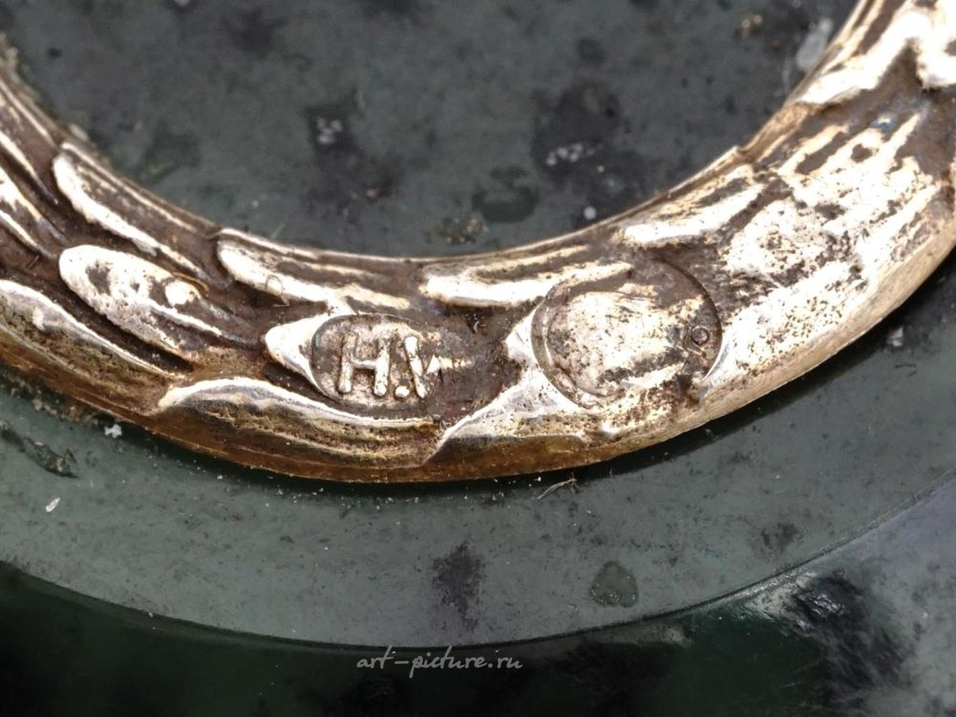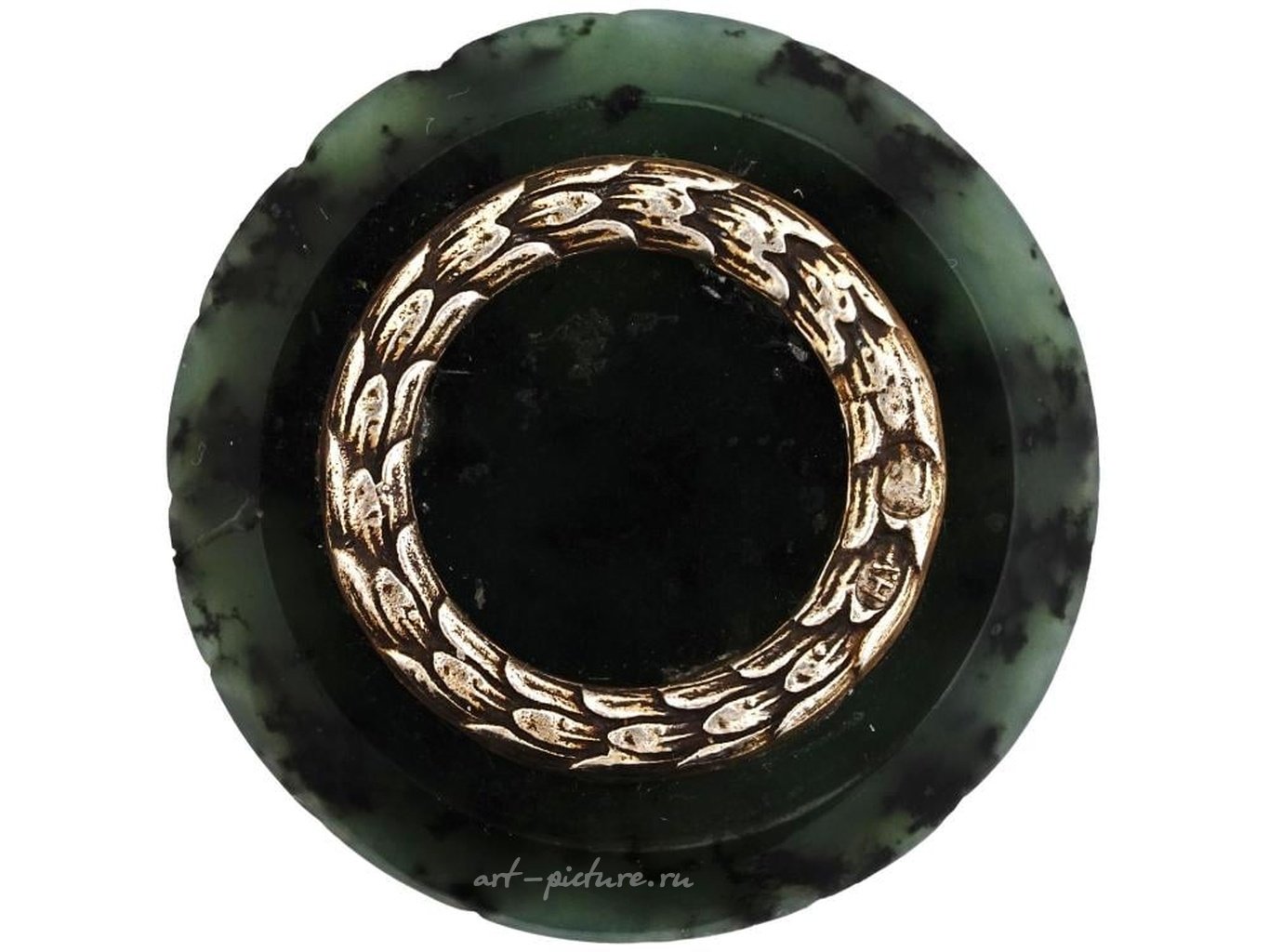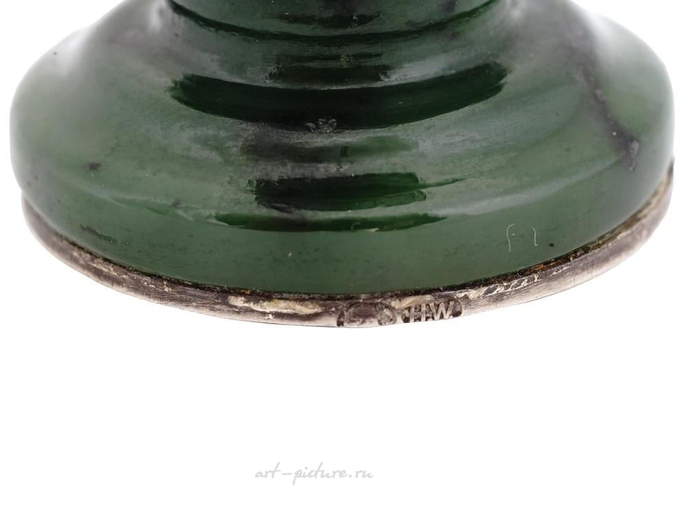Императорская русская вырезанная нефритовая печать с позолоченным серебряным неоклассическим декором. На изделии отпечатана русская каллиграфическая буква У. Маркировка серебра - стандарт 88, а марка изготовителя находится на серебряных частях. Русская серебряная посуда, ювелирные изделия, аксессуары для стола и декор.