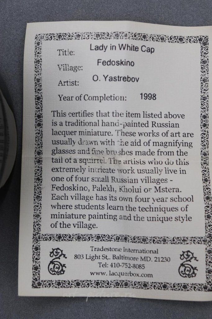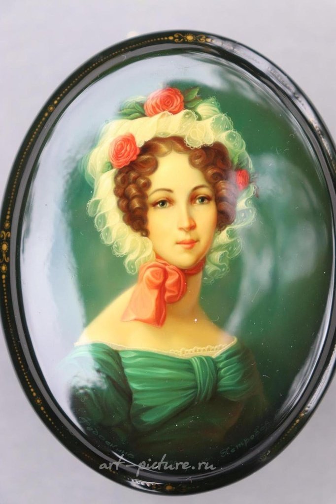 Дама в белой шапочке, выполненная О. Ястребовым в 1998 году, ручная роспись русской лаковой миниатюры Федоскино, сертифицированная; Высококачественный миниатюрный портрет благородной дамы. Размер: 80 мм х 60 мм х 44 мм = 8,0 см х 6,0 см х 4,4 см; Федоскинская миниатюра (русский: федоскинская миниатюра) - это традиционная русская лаковая миниатюра.