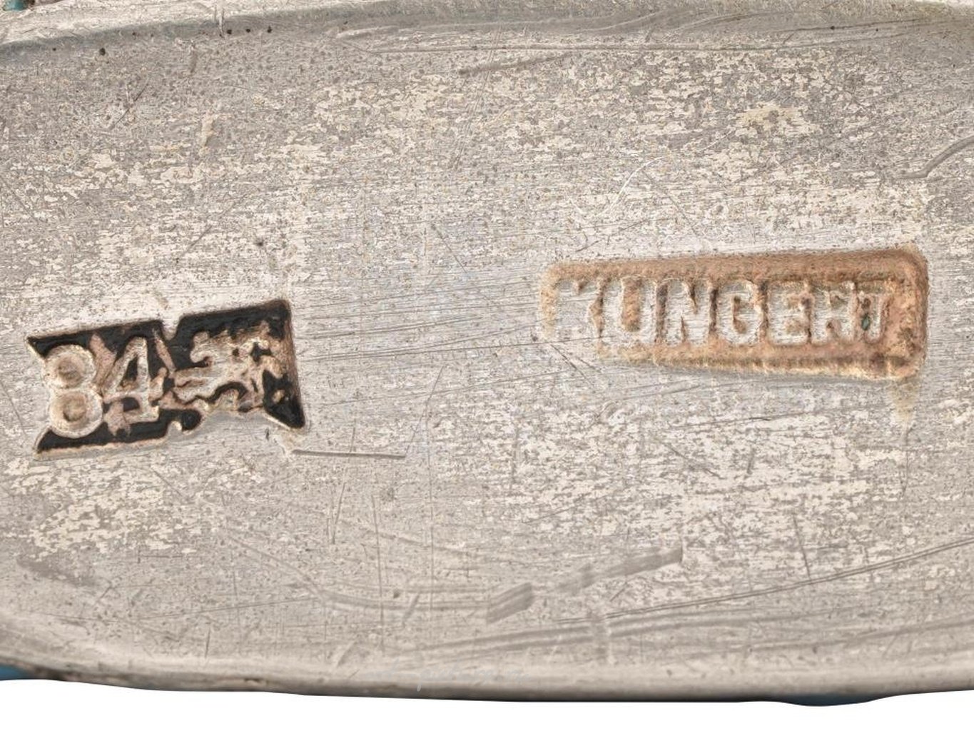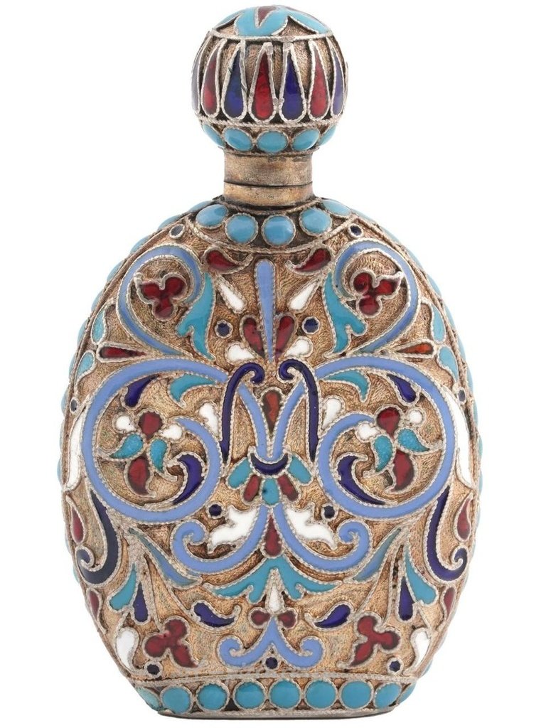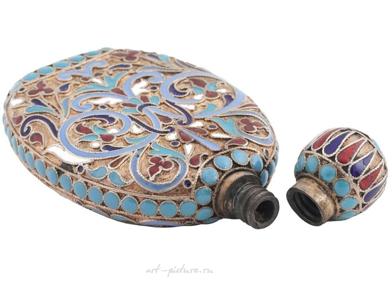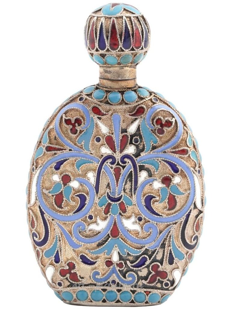Императорская русская серебряная парфюмерная бутылка с винтовой крышкой. Изделие украшено яркими эмалевыми декорациями в технике клоизонне. На дне имеется клеймо, указывающее на серебряный стандарт 84 и марку изготовителя Густава Клингерта. Вес бутылки составляет 51 грамм. Это коллекционный предмет русской серебряной посуды, ювелирных изделий и предметов туалетного стола.