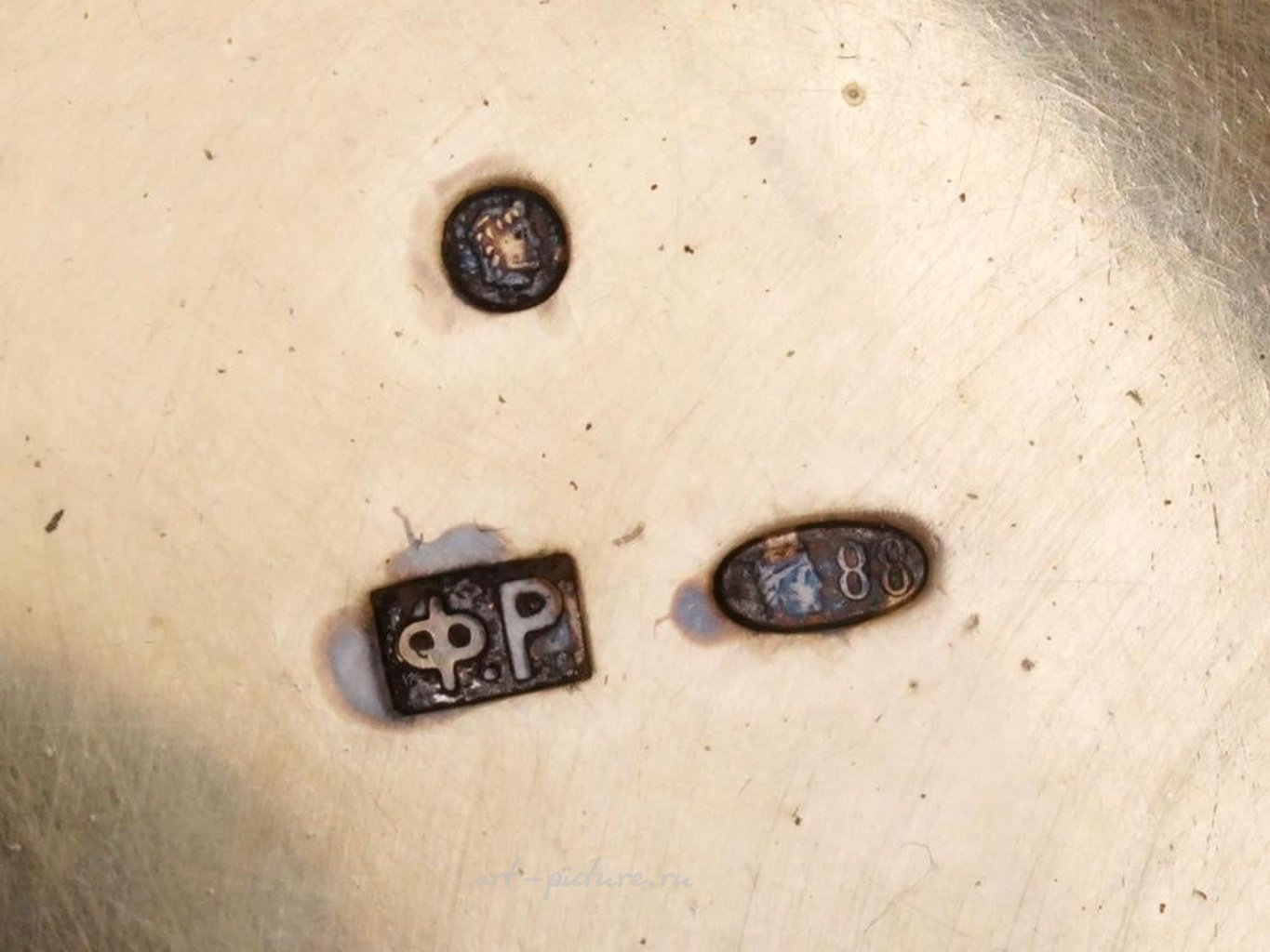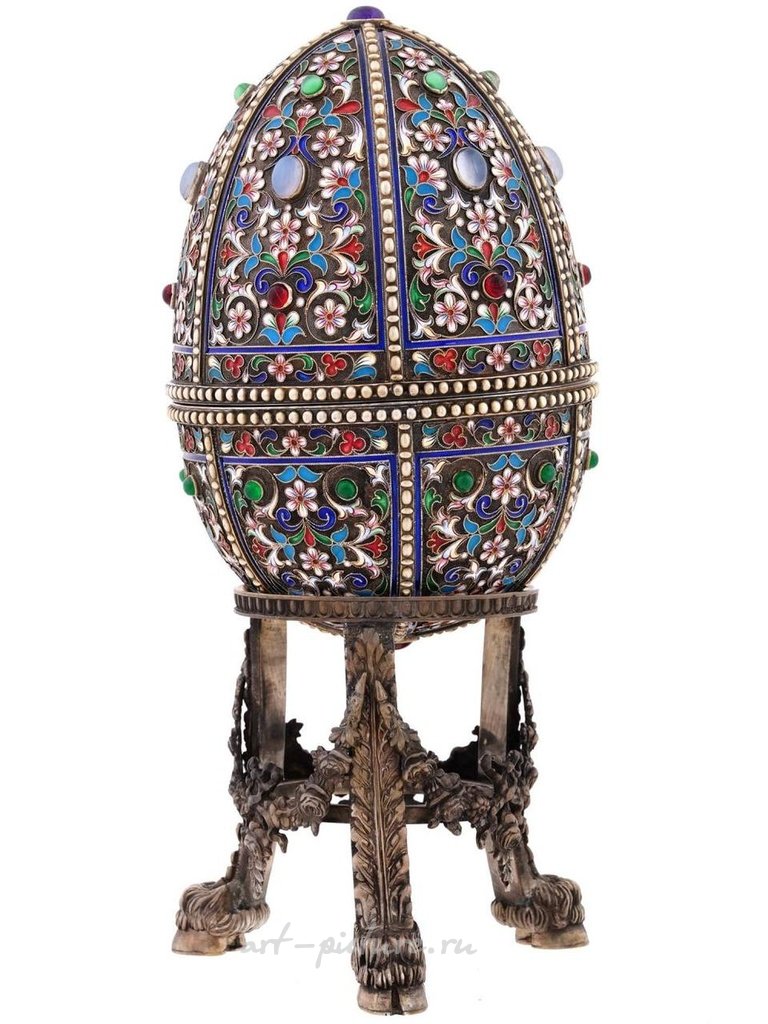 Большой русский серебряный пасхальный яйцевидный шкатулка из двух частей. Внешняя сторона яйца украшена полихромными цветочными, листовыми и геометрическими мотивами, выполненными в технике клоизонне. Внутреннее покрытие позолочено. Изделие украшено полудрагоценными камнями. Представлено с фигурной позолоченной серебряной подставкой на трех ножках. Ножки выполнены в форме копыт, украшены листьями, цветочными узорами и бантами, гравированными детальными узорами.