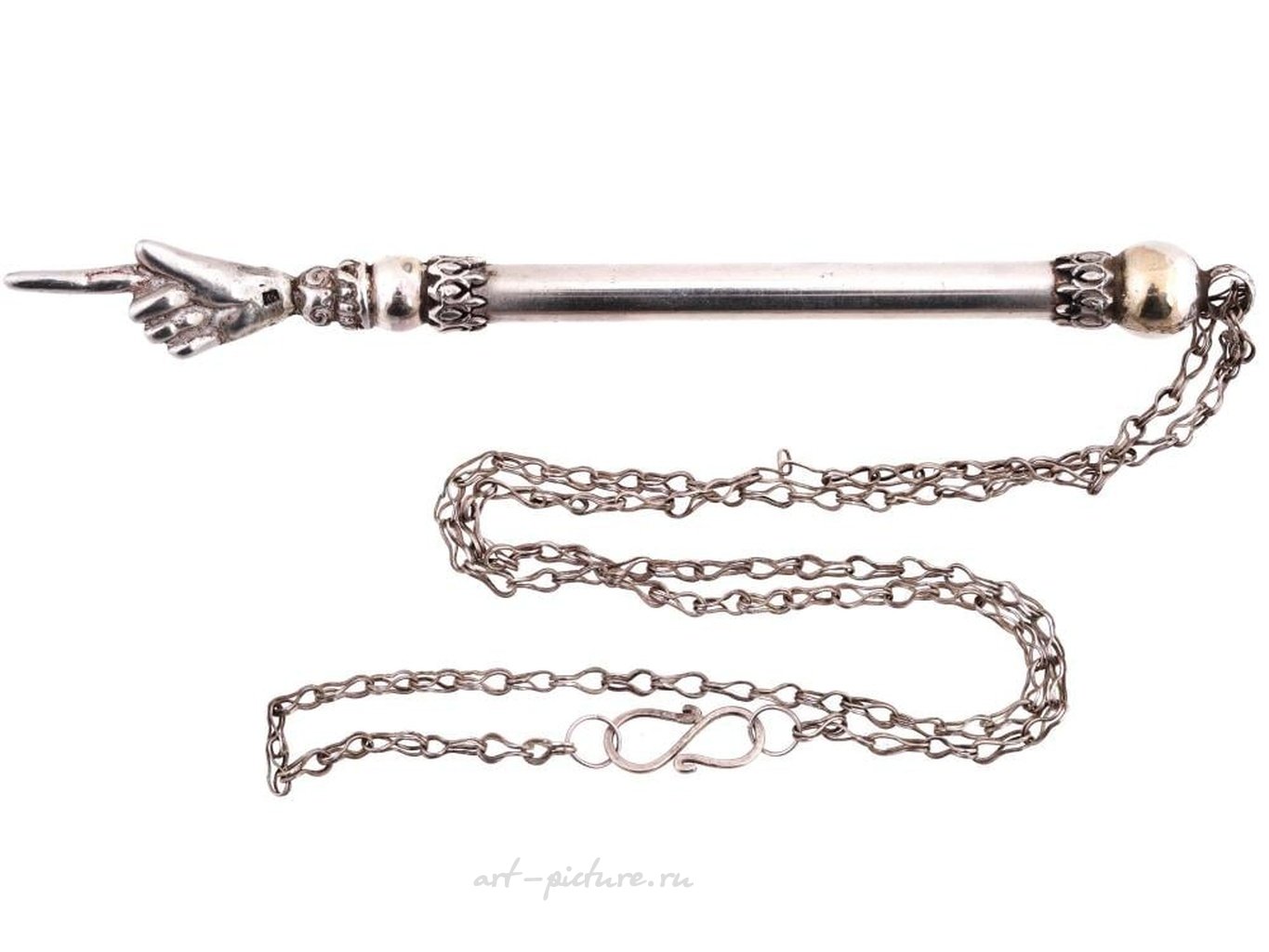 Русская иудейская серебряная точилка для Торы, также называемая Яд. Кончик тщательно выполнен в форме вытянутой руки с указующим пальцем. Полностью оснащена цепочкой. Отмечена отличительной маркировкой русского серебра 84 пробы. Русская серебряная посуда, иудейские религиозные и духовные предметы для коллекционеров. Вес: 23 г.