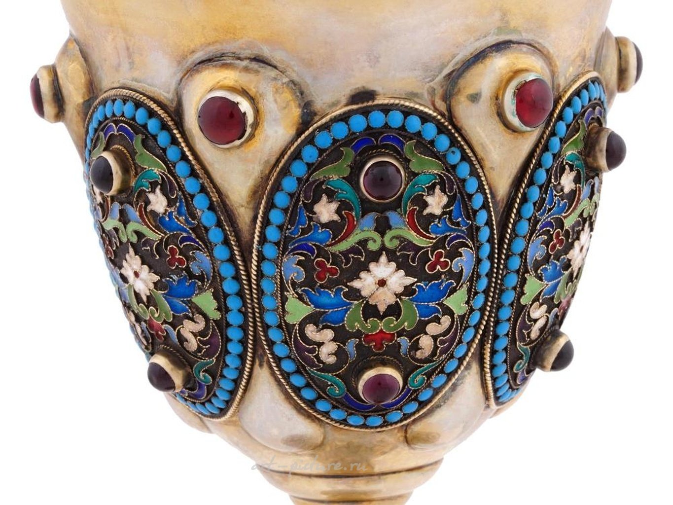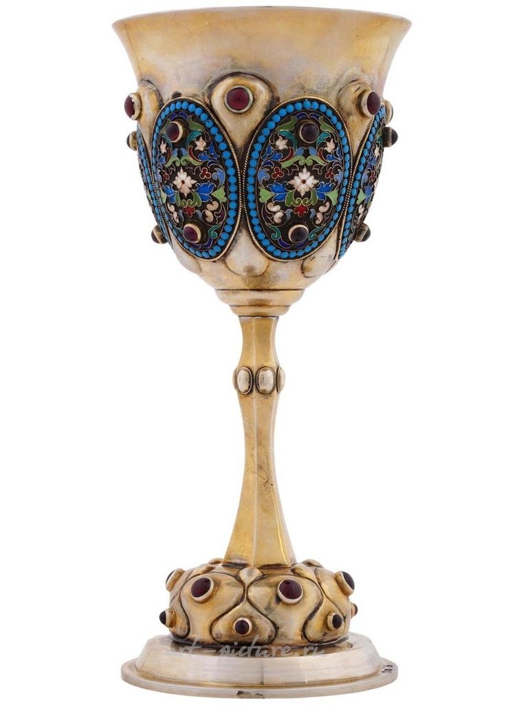 Кидуш-кубок русской юдейской работы из серебра 84 пробы с позолотой и эмалью. Кубок украшен овальными медальонами, покрытыми полихромными цветочными, растительными и геометрическими узорами, выполненными в технике клоизонне, украшенными рубинами и аметистами. Основание выполнено в рельефном дизайне и украшено рубинами. Маркировано стандартной русской пробирной маркой 84 серебра, маркой производителя и другими марками. Общий вес: 237 г. Русский.