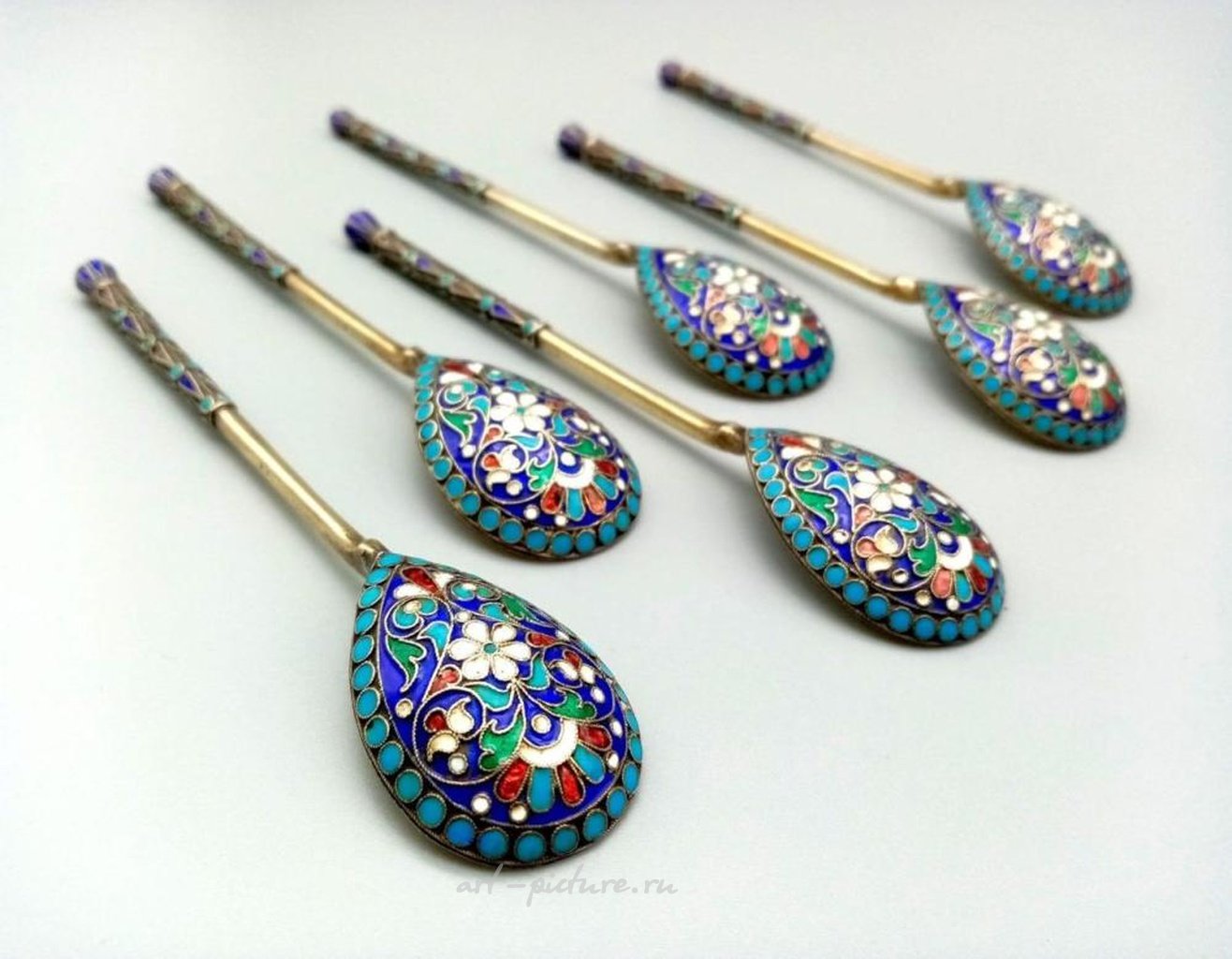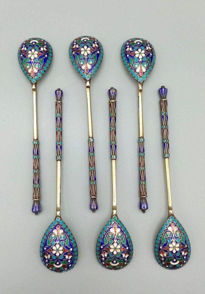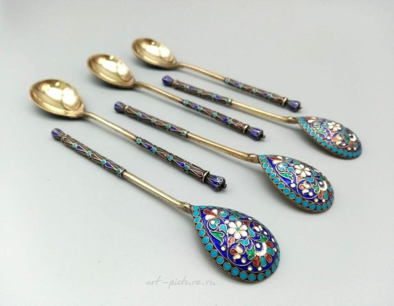 Шесть серебряных чайных ложечек с позолотой, украшенных русской эмалью клузонне, в оригинальном футляре. Прекрасный набор из шести серебряных чайных ложечек с позолотой, украшенных русской эмалью клузонне, в оригинальном футляре. Ложечки имеют отметку Московской пробы 1895 года; полихромная эмальная отделка выполнена в виде цветочных и витых узоров внутри бисерных границ. Дата: 1895 год - 19 век Высота - 5 дюймов Вес 4.01 унции Состояние: Отличное состояние, эмаль имеет нормальный износ с возрастом, как и ожидалось.