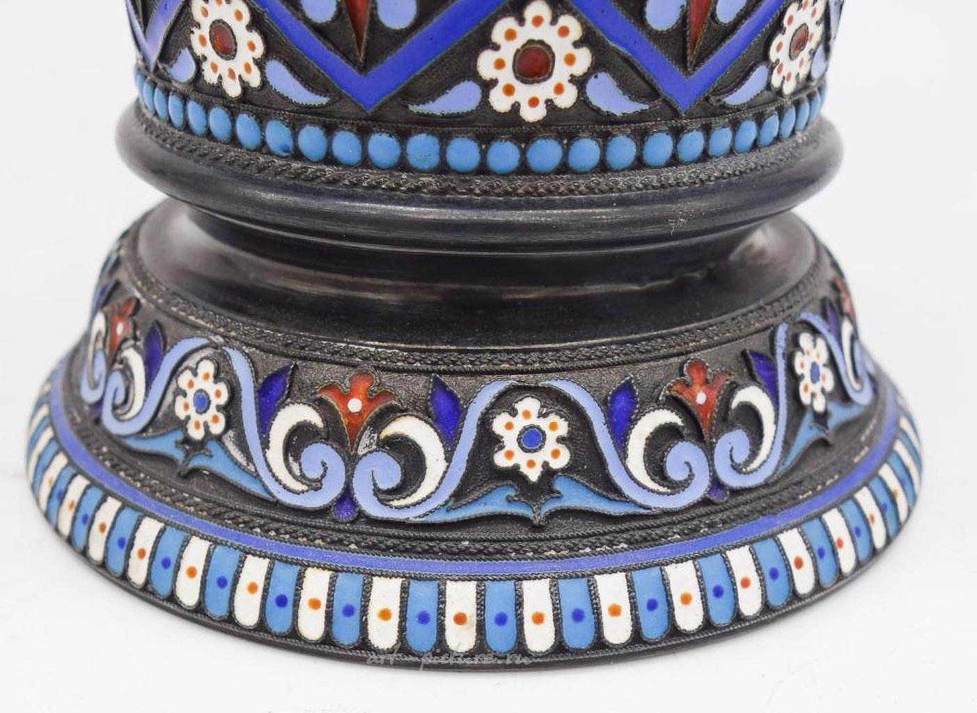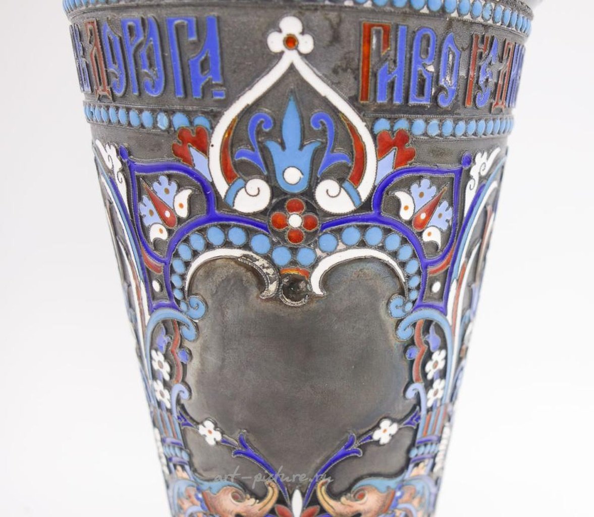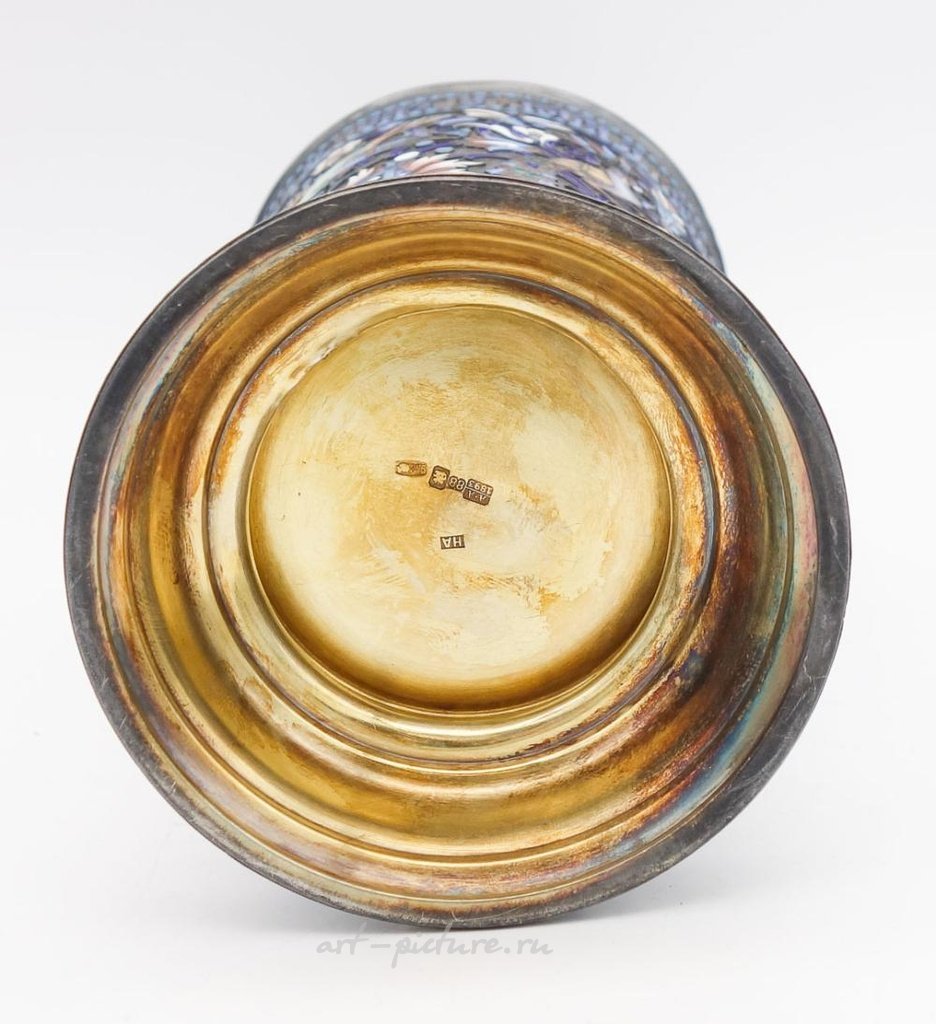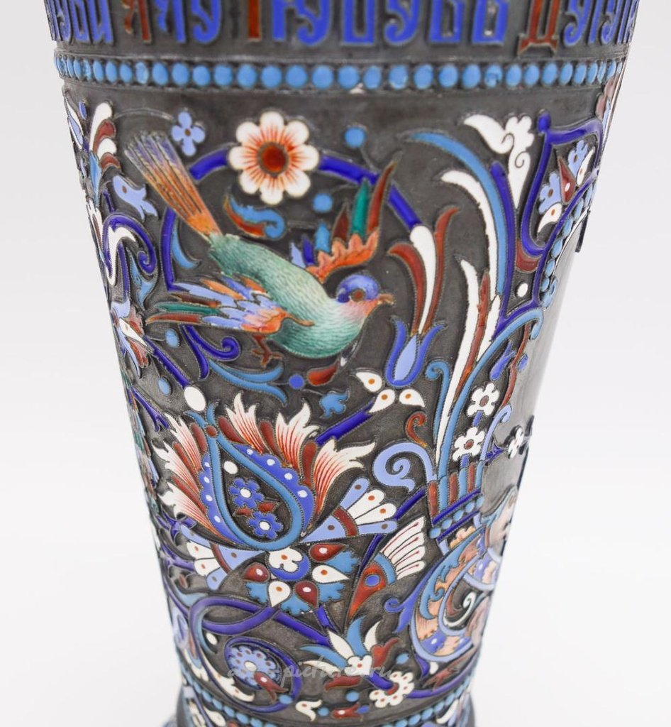 Это изысканная императорская русская серебряная позолоченная ваза в стиле бокала с изысканными эмалевыми изображениями птиц, цветов и листьев. Известный московский серебряник Николай Алексеев. Высота 8 дюймов. Диаметр верхней и нижней части составляет соответственно 4 и 3 3/4 дюйма. Общий вес составляет 15,45 тройских унций.