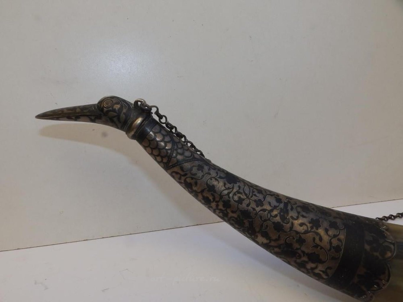 Большой русский рог для питья до революции с серебряными вставками, имеющий терминал в виде головы птицы, арабесковую резьбу на монтажах и надпись на основании, длиной 31 дюйм.