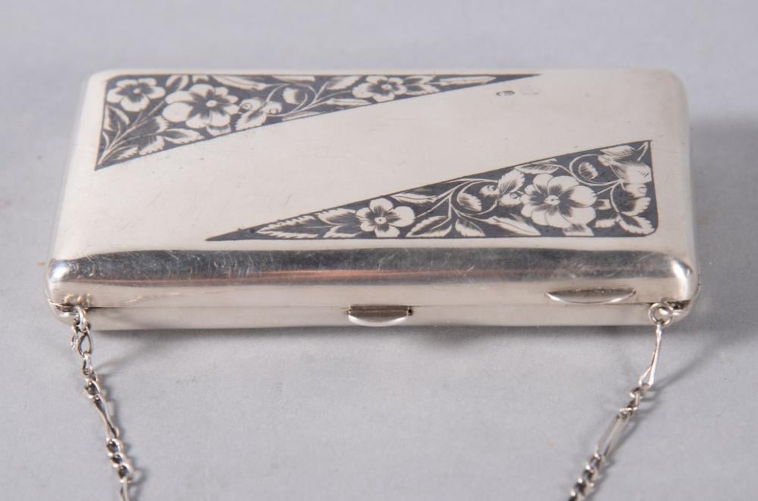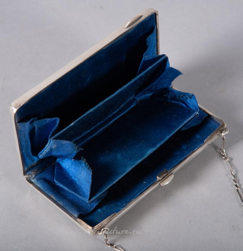 Антикварная русская сумочка из серебра "84" и ниелло. Россия, 1908-1917 гг. Сумочка украшена цветочными мотивами с обеих сторон. У нее есть серебряная ручка из звеньев, а наличник сумочки имеет замок на ноготь. При открытии сумочка раскрывается, показывая подкладку из голубого шелка. На передней стороне имеются клейма с указанием серебряного стандарта "84 золотника", правостороннего Кокошника и кириллического маркировки производителя. Примерный размер составляет 5 дюймов.