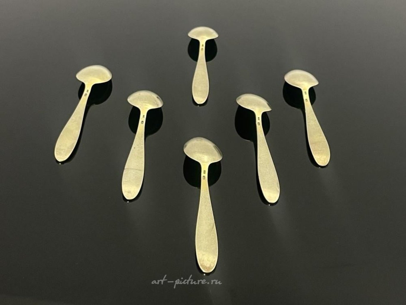Набор из шести советских русских серебряных чайных ложек с позолотой и эмалью в технике клоизонне.