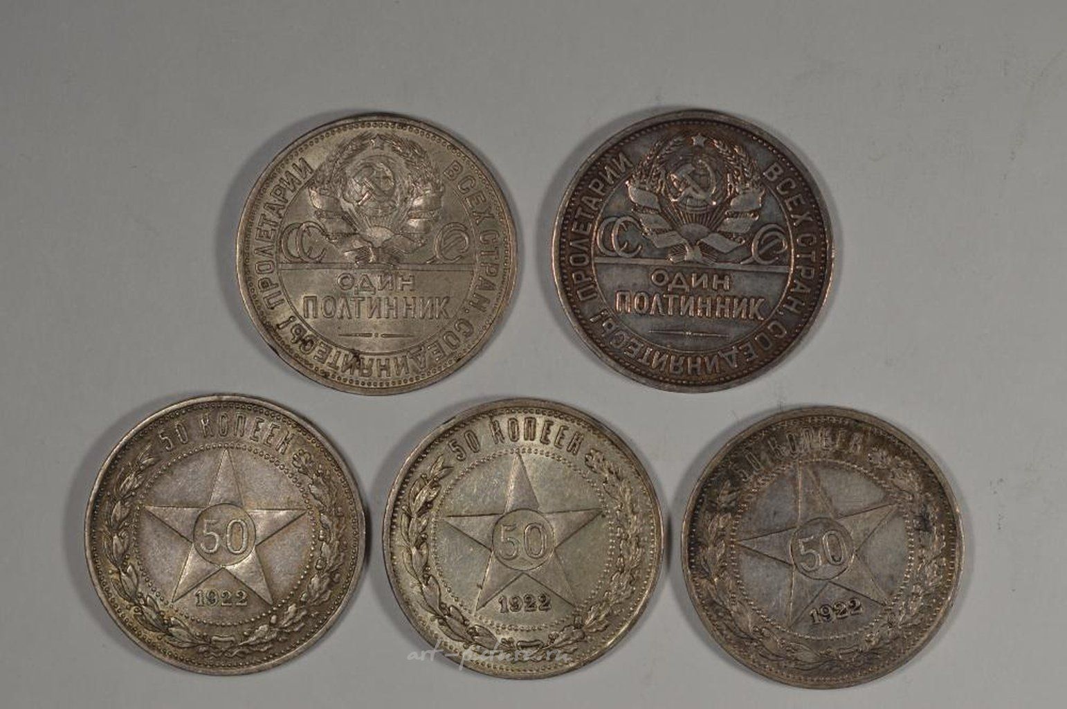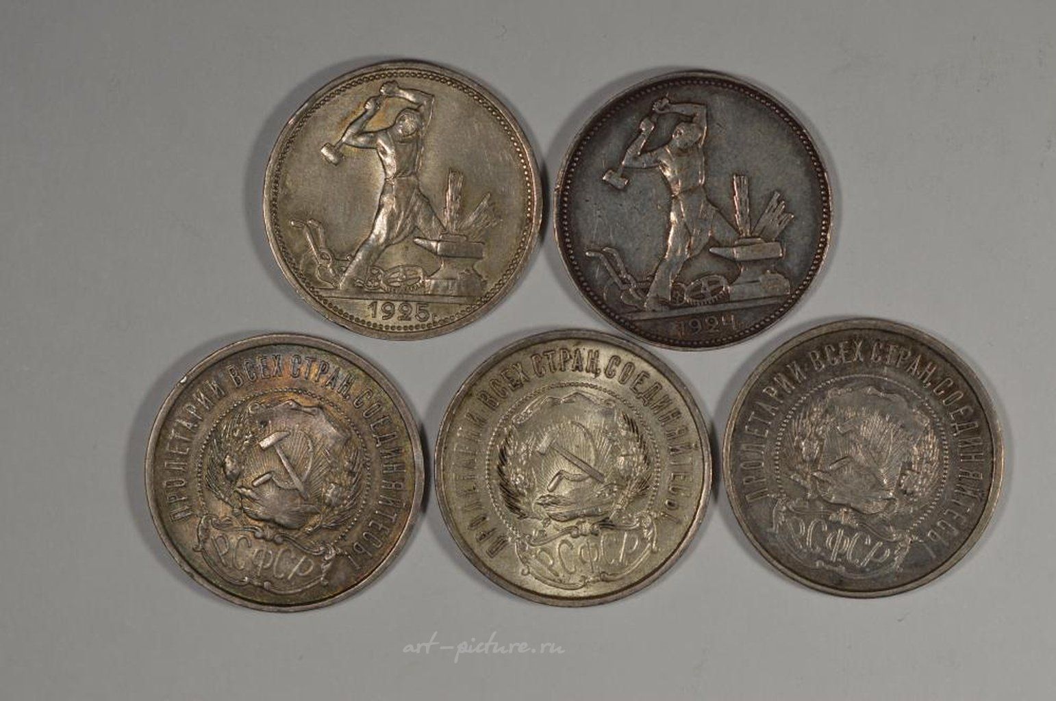 Советская русская пятерка монет из серебра 50 копеек, около 1920-х годов, в следующих номиналах: 1922 год (3 шт.) KM-Y83; 1924 год KM-Y89.1; 1925 год KM-Y89.2. Оценки состояния: AU, EF+ (2 шт.), Ch VF и AU+ соответственно. Всего 5 монет. Оценочная стоимость - $90.