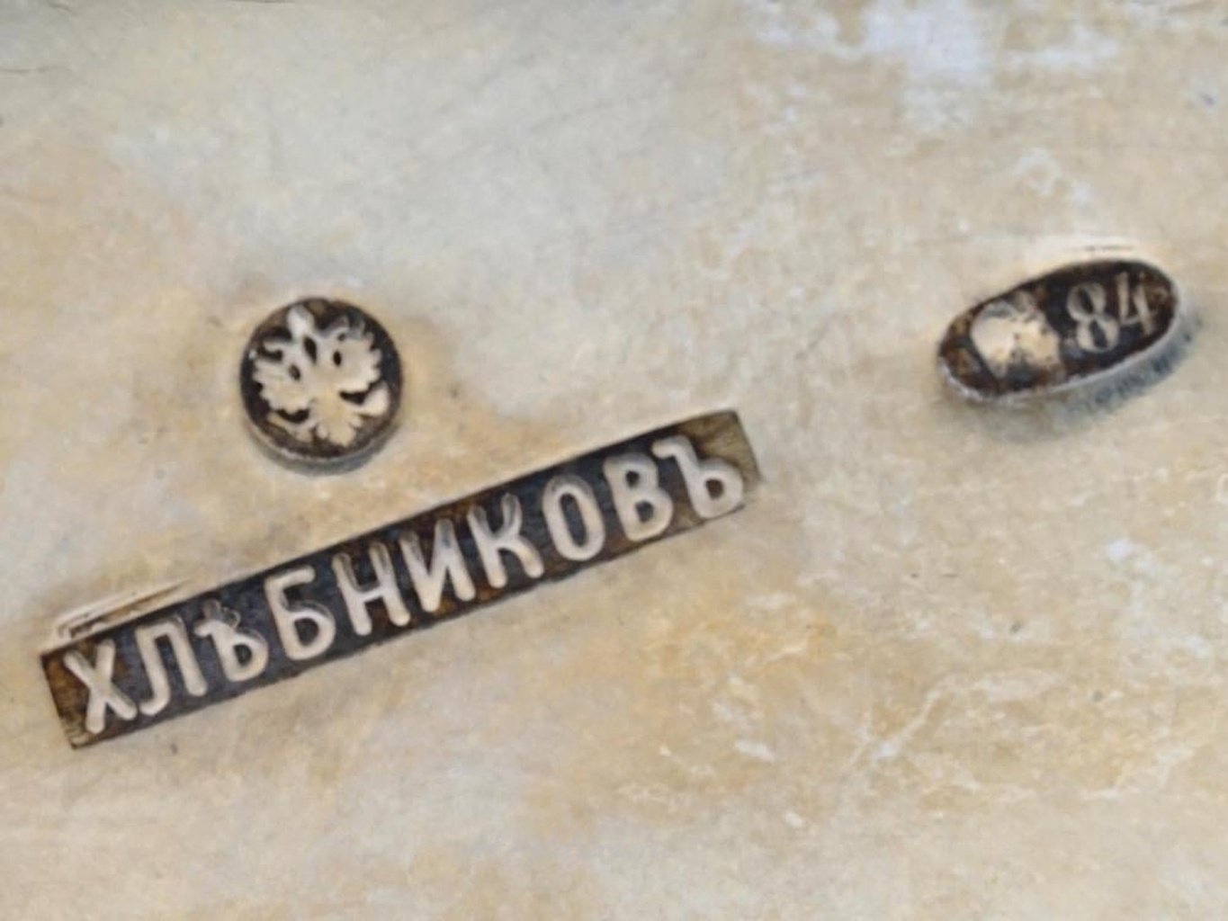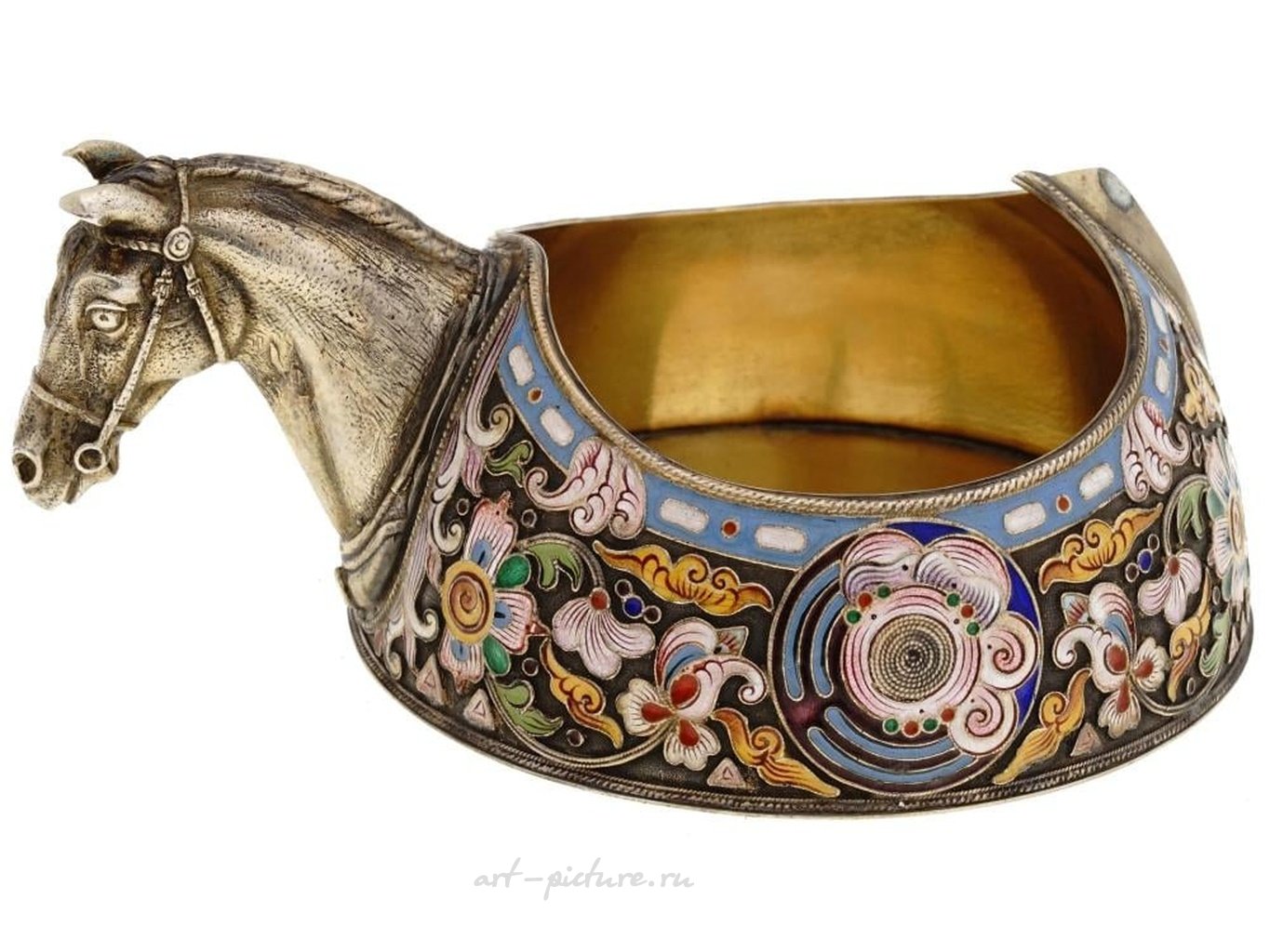 Русский серебряный ковш 84 пробы. Традиционно форма ковша украшена фигурной ручкой, выполненной в форме коня и эмалированной синим, белым, оранжевым, зеленым, розовым, кобальтовым и красным цветами и растительными узорами, выполненными в технике клоизонне. Маркировка стандартной серебряной печатью и другими ассейскими и кириллическими марками на дне. Вес 210 г. Русское серебро и изделия из натуральных камней ювелирных изделий и коллекционных предметов.