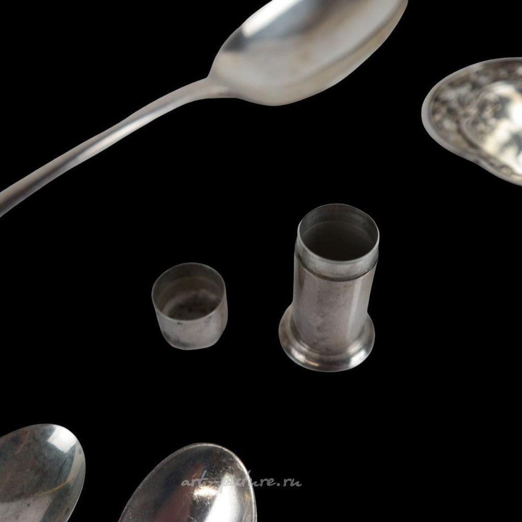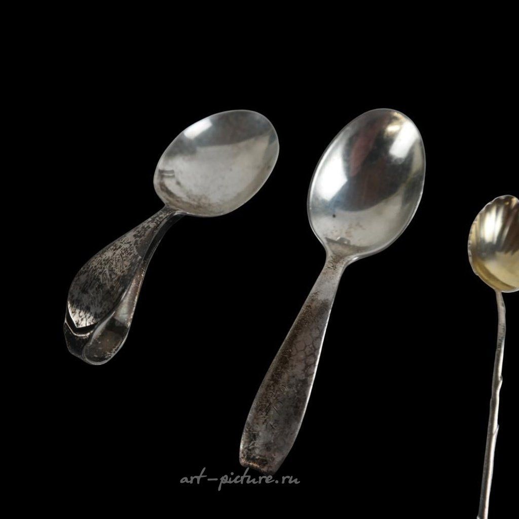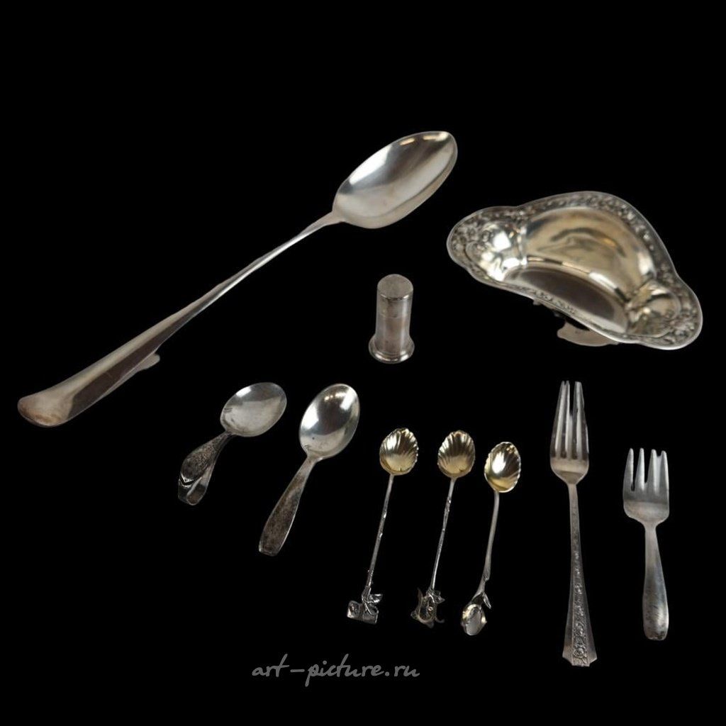 Различное серебро, включая маленькую чашку, ложки, в том числе детский набор Tiffany & Co. и большую русскую серебряную ложку для начинки [13" длиной]. (12 тройских унций).