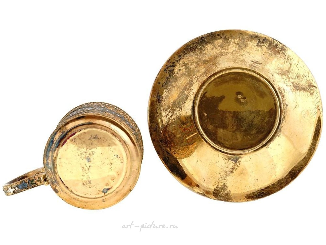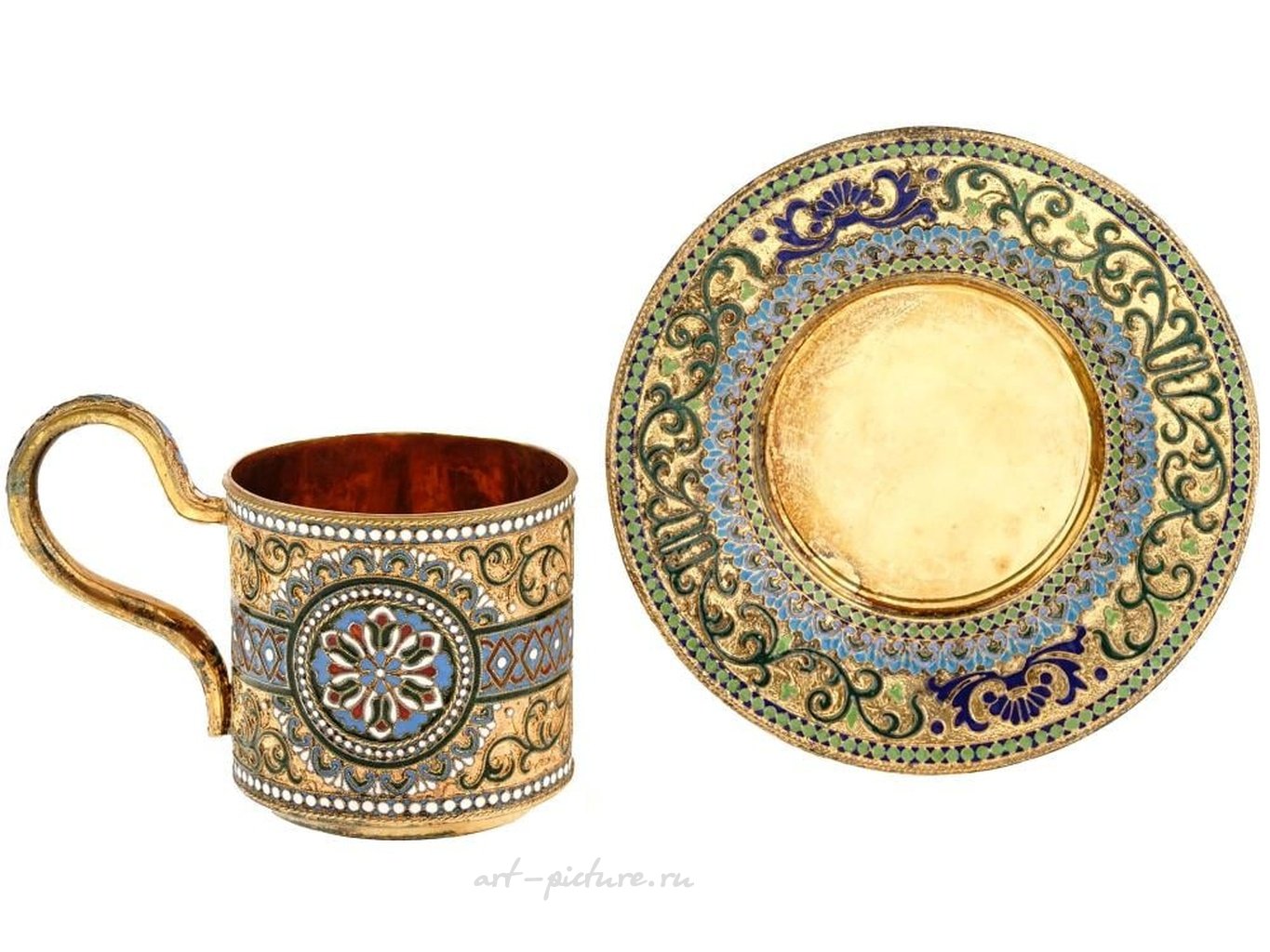 Высоко декоративная русская серебряная чашка и блюдце. Оба изделия украшены изысканными полихромными эмалевыми рисунками в технике клоизонне, изображающими завитки листвы и геометрические мотивы, дополненные бисерными краями. На чашке также присутствует круглая центральная медальон с цветочным узором. Оба изделия имеют клейма с 88-м имперским русским серебряным стандартом и другими русскими клеймами. Русская серебряная посуда для стола - коллекционные предметы интерьера. Общий вес: 242 г.