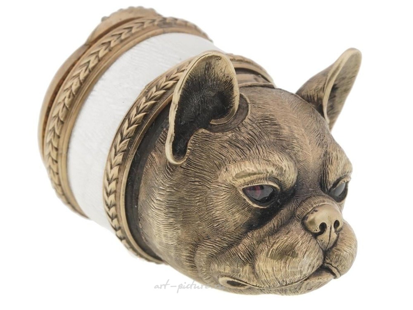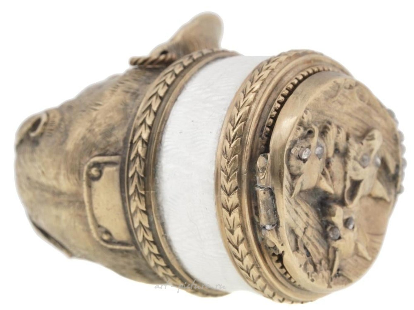 русское, позолоченное и эмалированное, в виде снюс-бокса в форме головы бульдога. Изделие украшено гравировкой с детальными узорами, инкрустировано рубиновыми глазами и бриллиантами. На крышке снюс-бокса изображены три головы лис, выдолбленные и украшенные бриллиантами. Воротник покрыт эмалью белого оттенка. Представлено в оригинальной коробке. Русские изделия из серебра и коллекционные предметы.